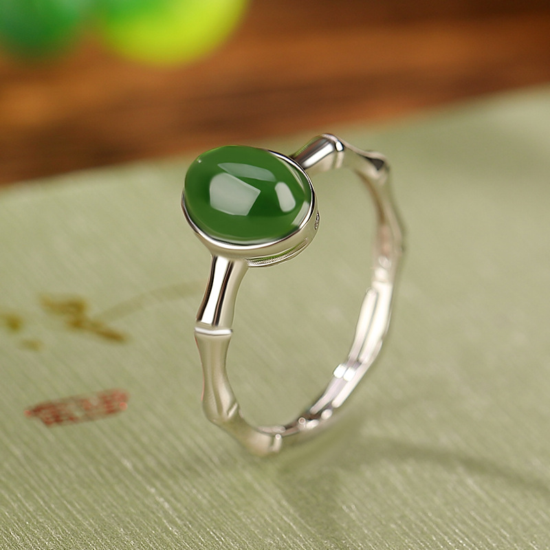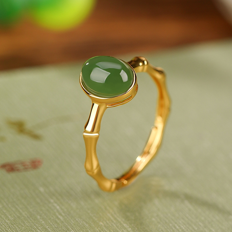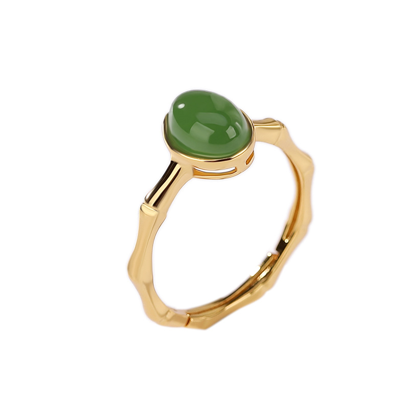 轻奢高级感s925纯银镀金和田玉碧玉竹节蛋面戒指古风简约小众设计