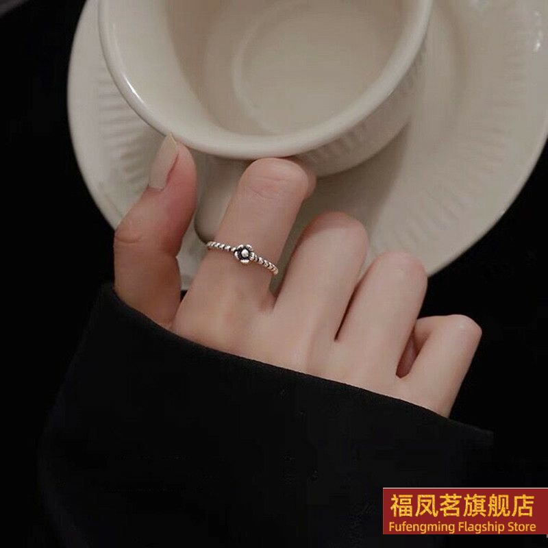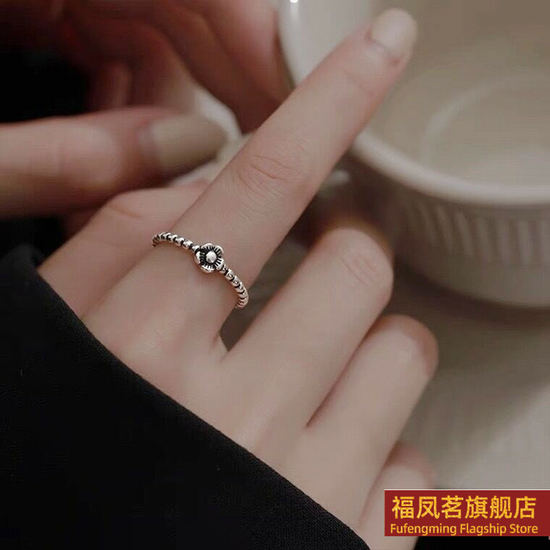 正生勿忘我复古花朵纯银戒指女个性刻字小众设计食指开口调节指环