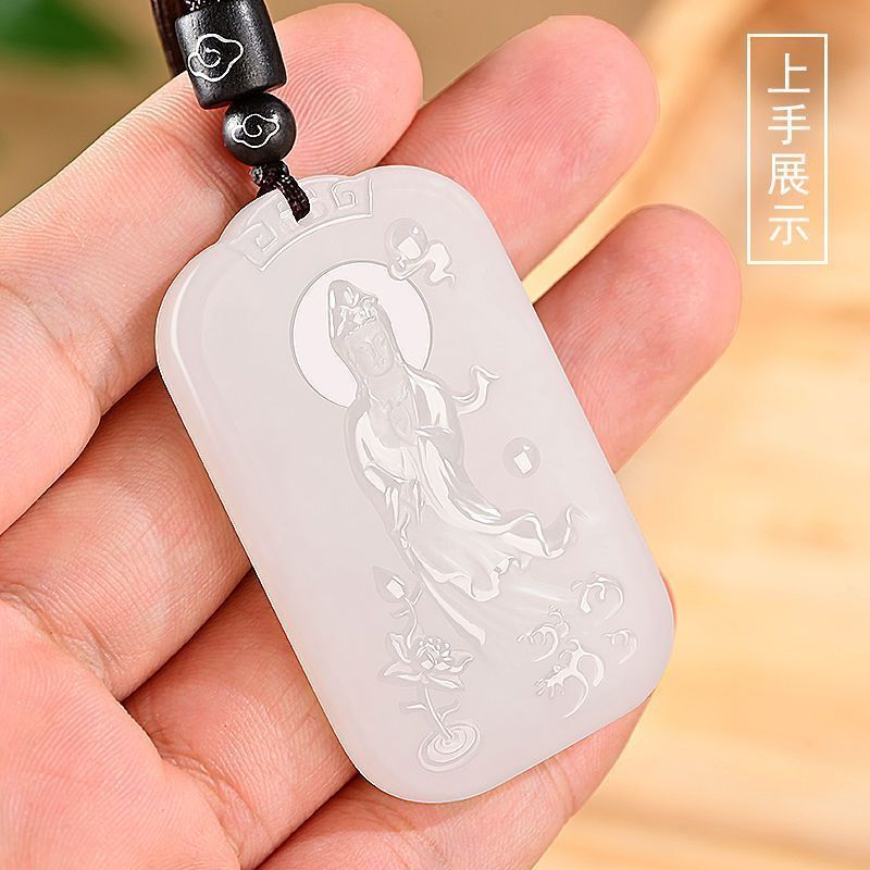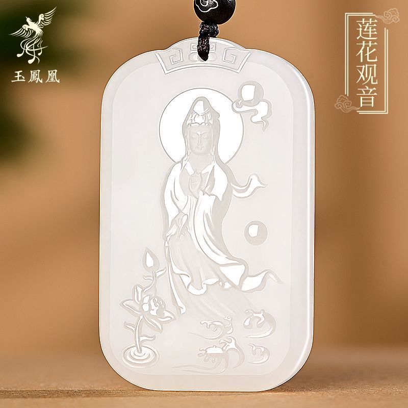 和田色羊脂白玉观音玉牌吊坠男女款玉石莲花菩萨玉佩玉