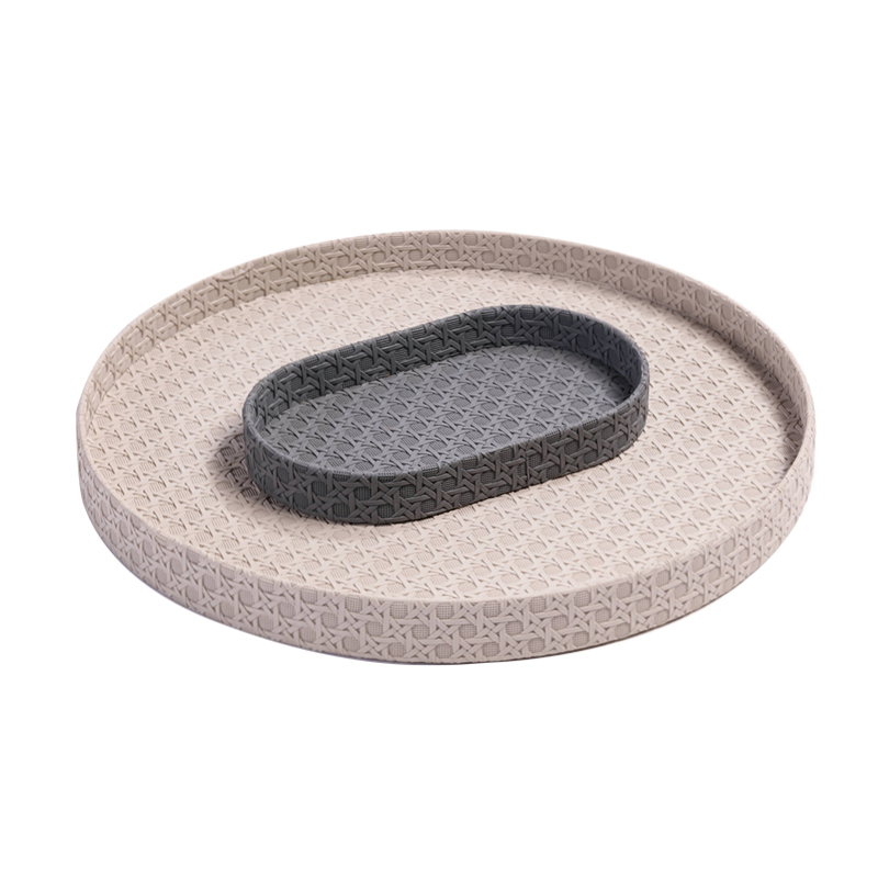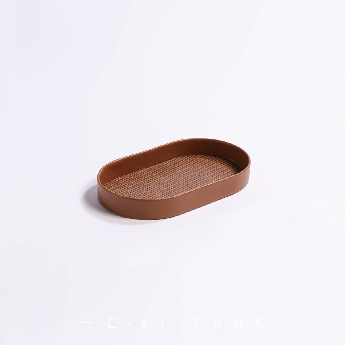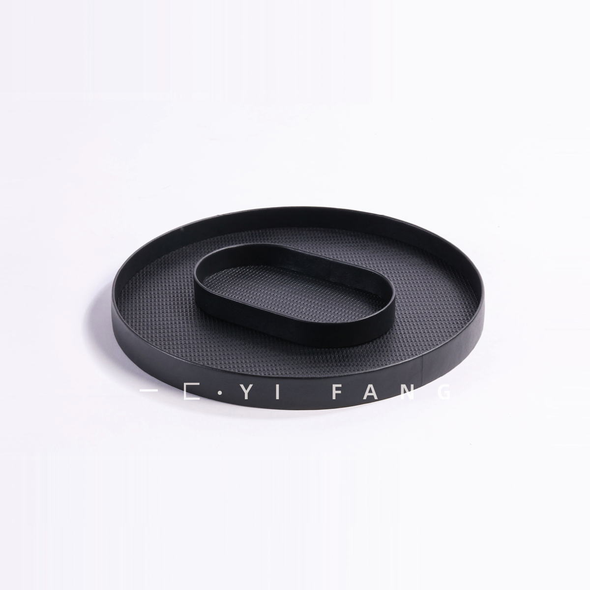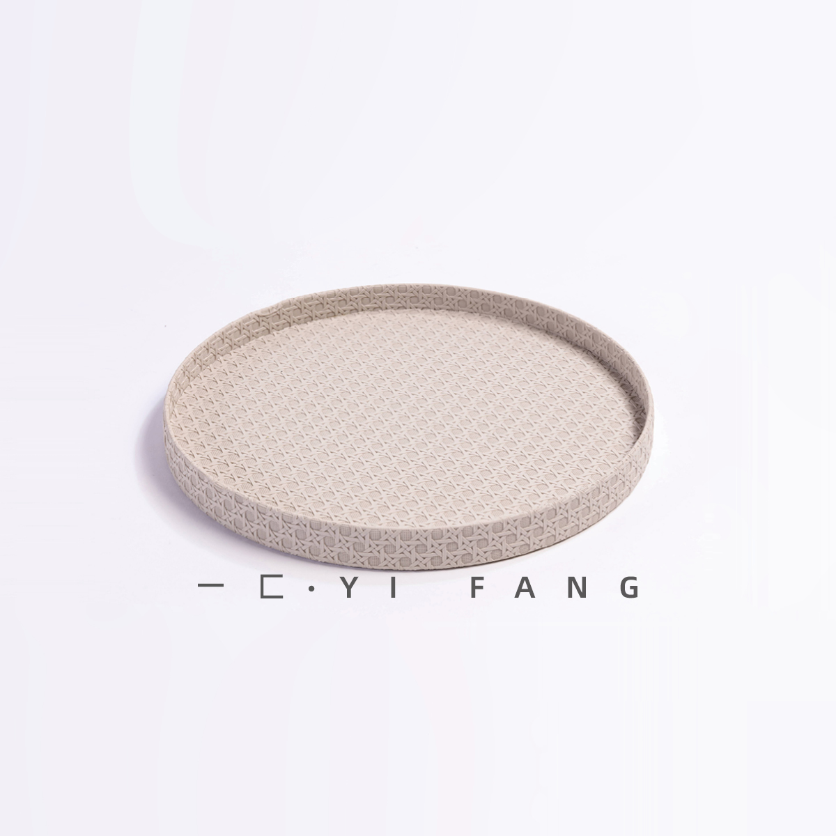 一匚轻奢皮革编织纹圆形托盘样板间售楼部茶几卧室装饰收纳盘摆件
