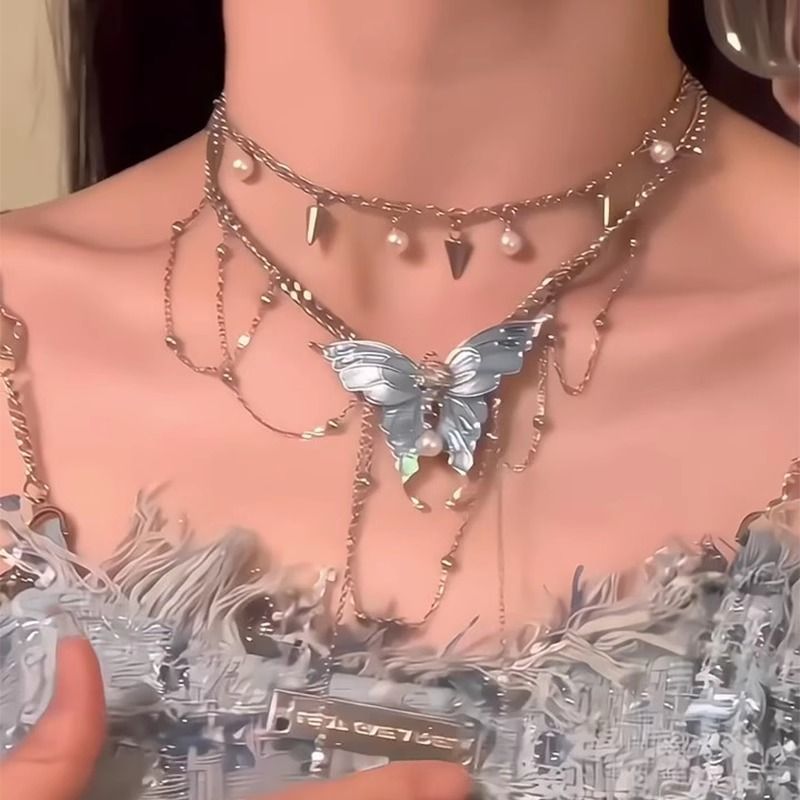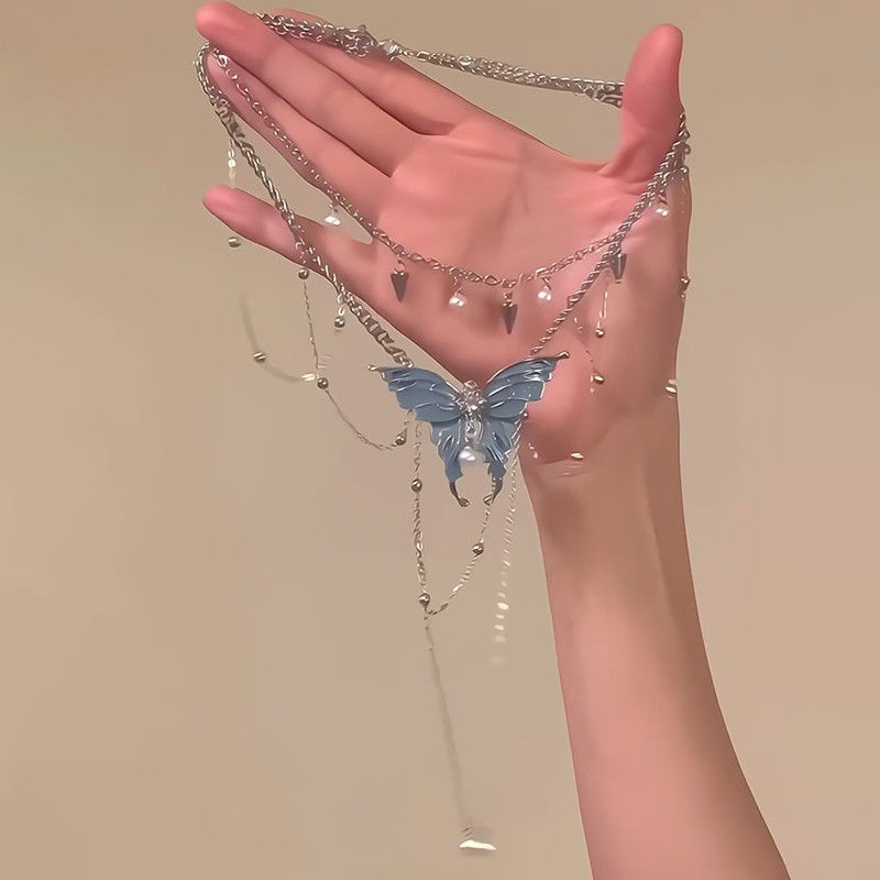 「野蛮生长」甜酷风蓝色蝴蝶双层项链新款小众独特夏日精致锁骨链