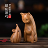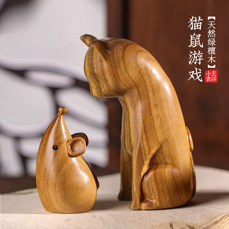 天然绿檀木雕刻猫和老鼠小摆件桌面创意装饰品木质文玩手把件卡通