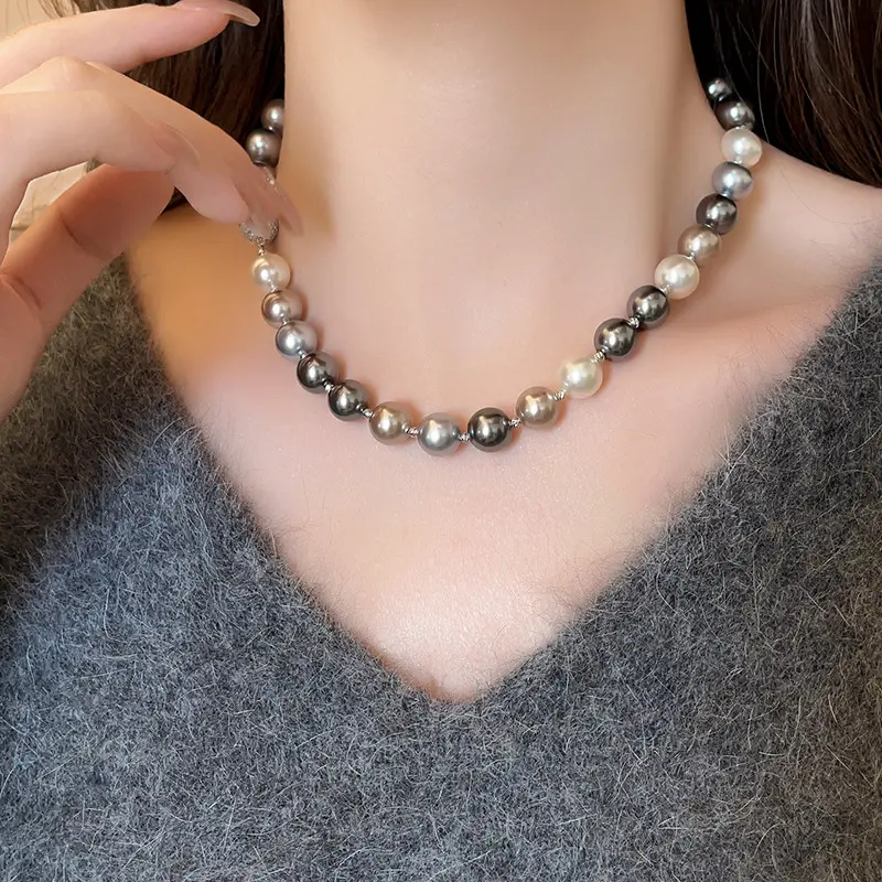 高级感灰色珍珠款锆石磁吸项链简约设计感锁骨链法式复古轻奢项饰