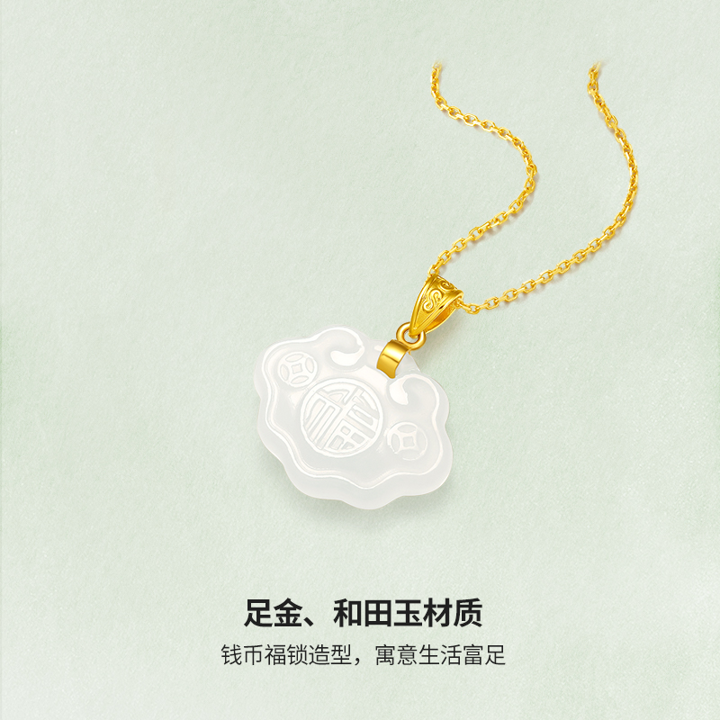 周六福旗舰店和田玉吊坠女金镶玉黄金如意福锁玉坠挂件节日礼物