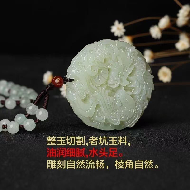 和田色龙凤呈祥圆形挂件天然阿富汗白玉龙凤吊坠链情侣玉石吊坠