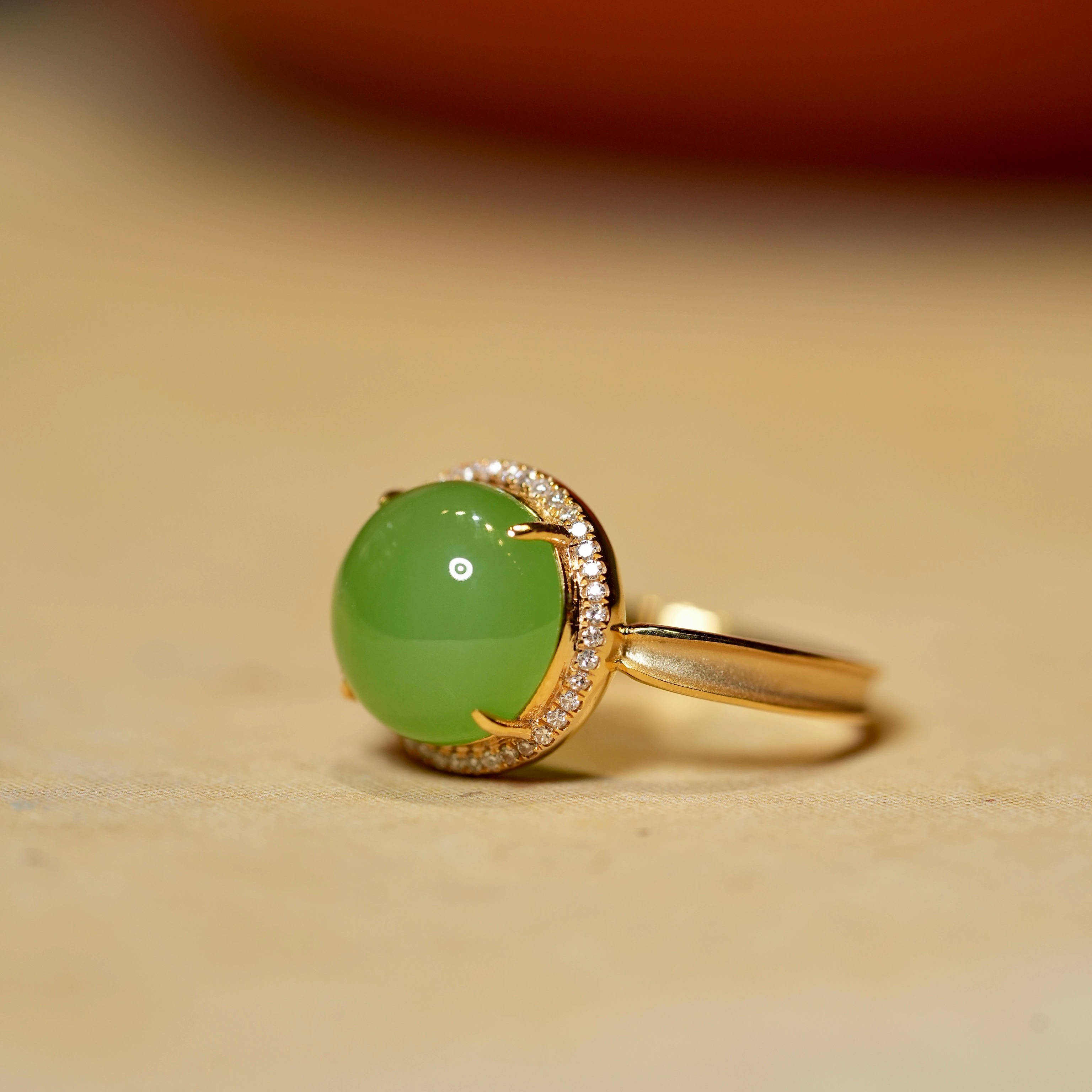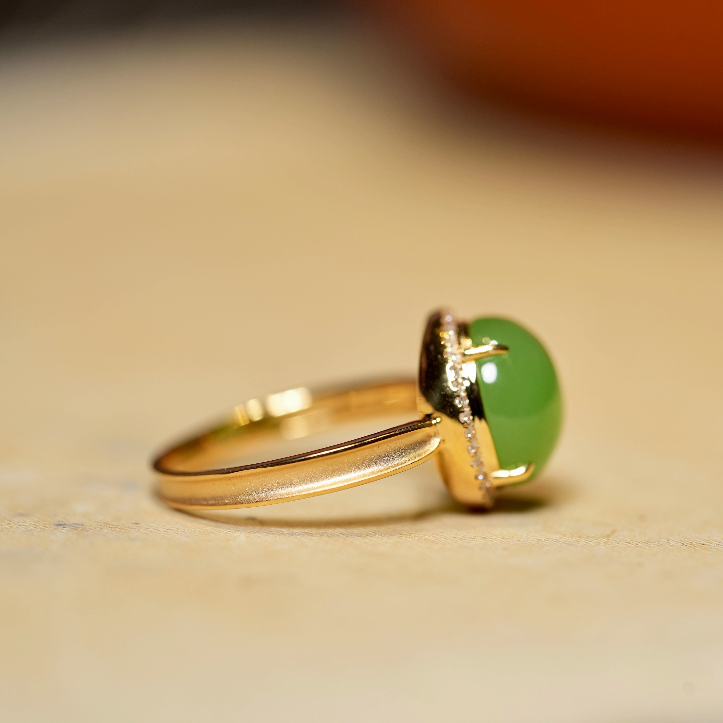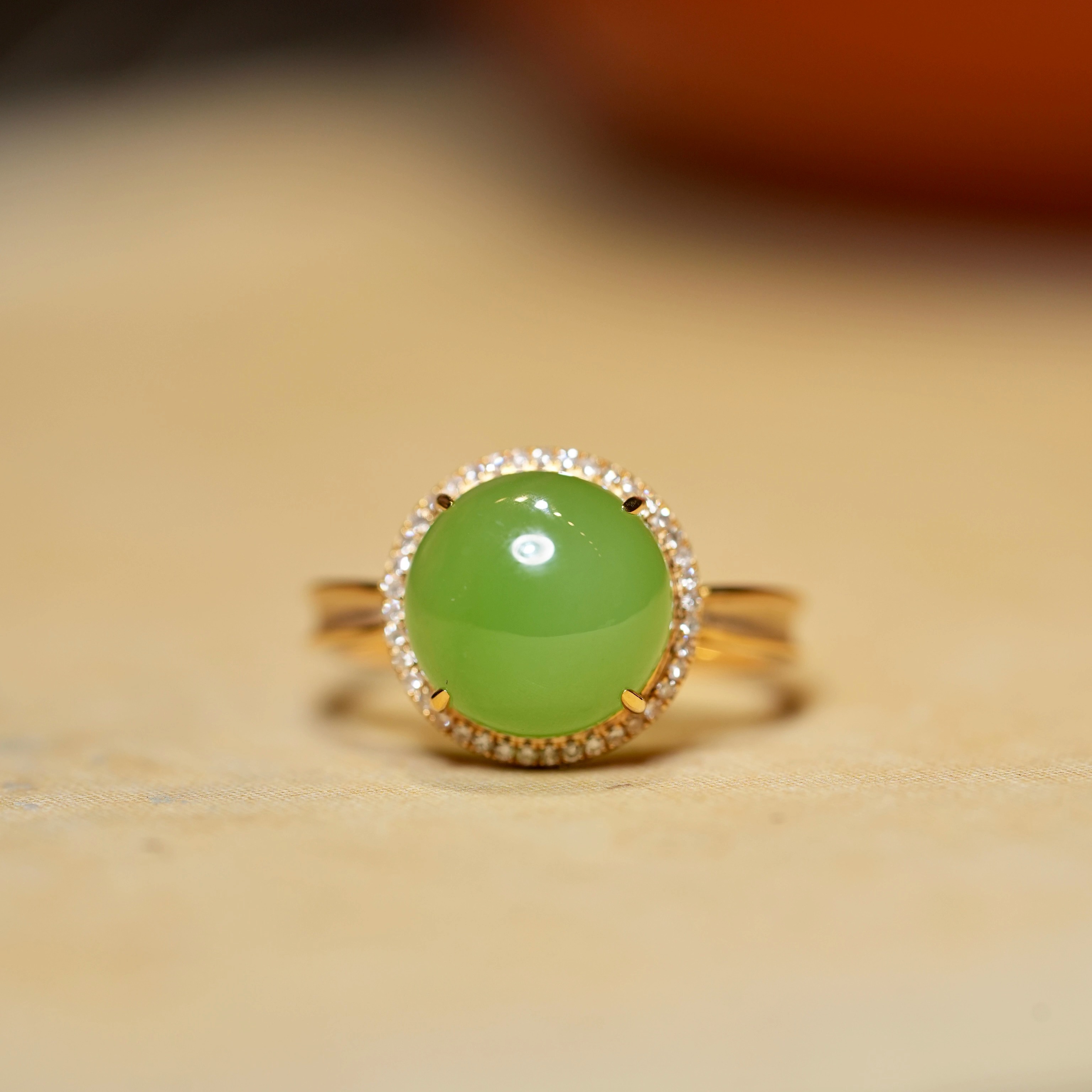 天然和田玉俄罗斯碧玉苹果绿圆蛋面戒指18k金镶嵌时尚百搭饰品