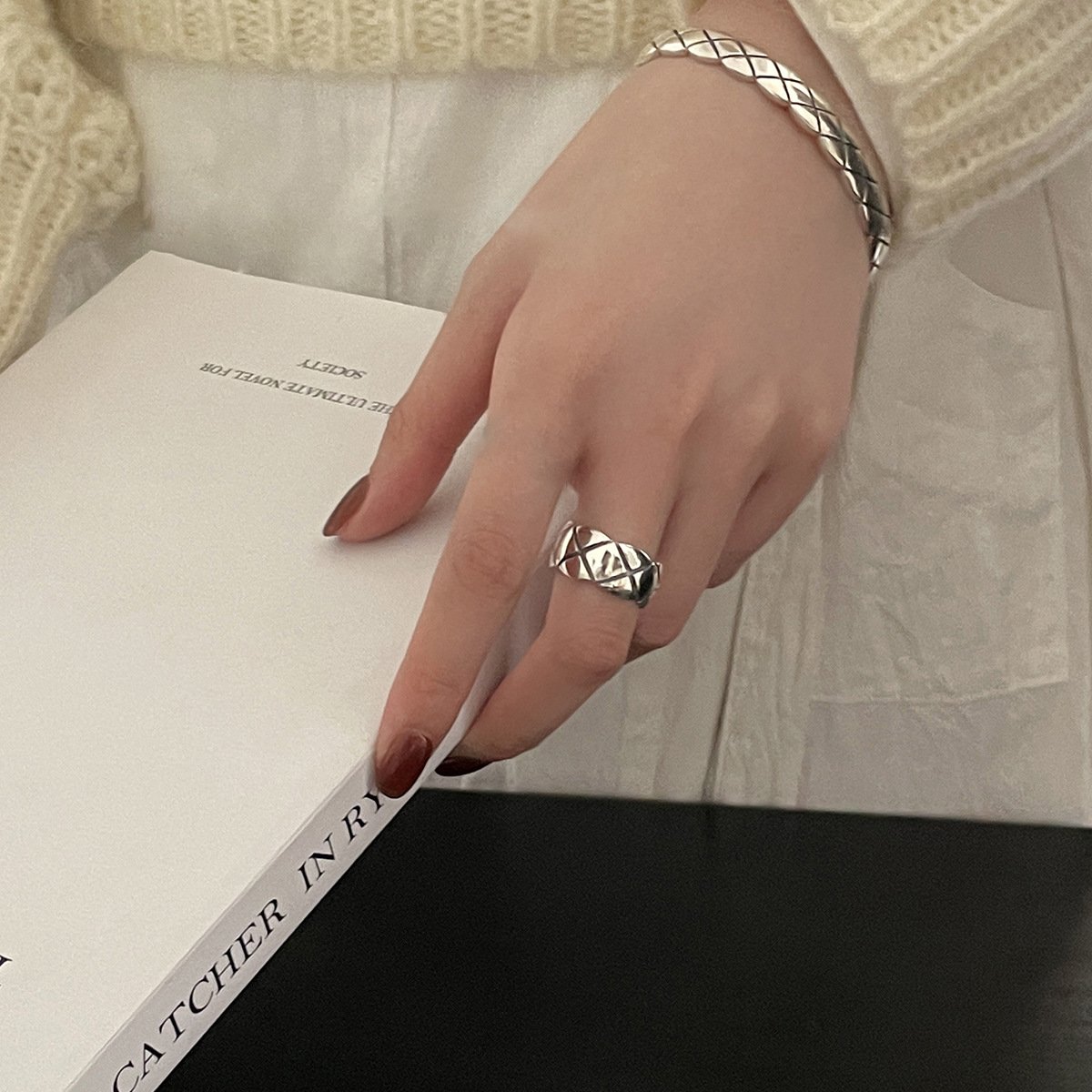 s925纯银菱格纹戒指女小众设计高级感复古小香风活口可调节食指戒