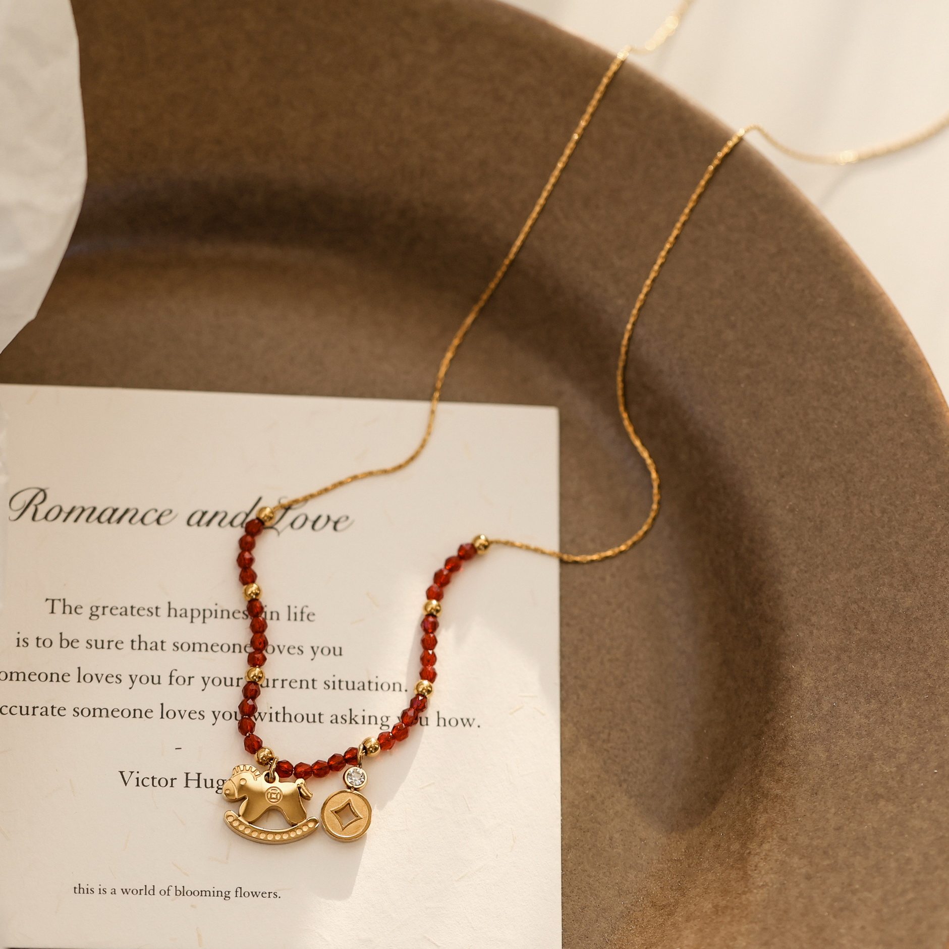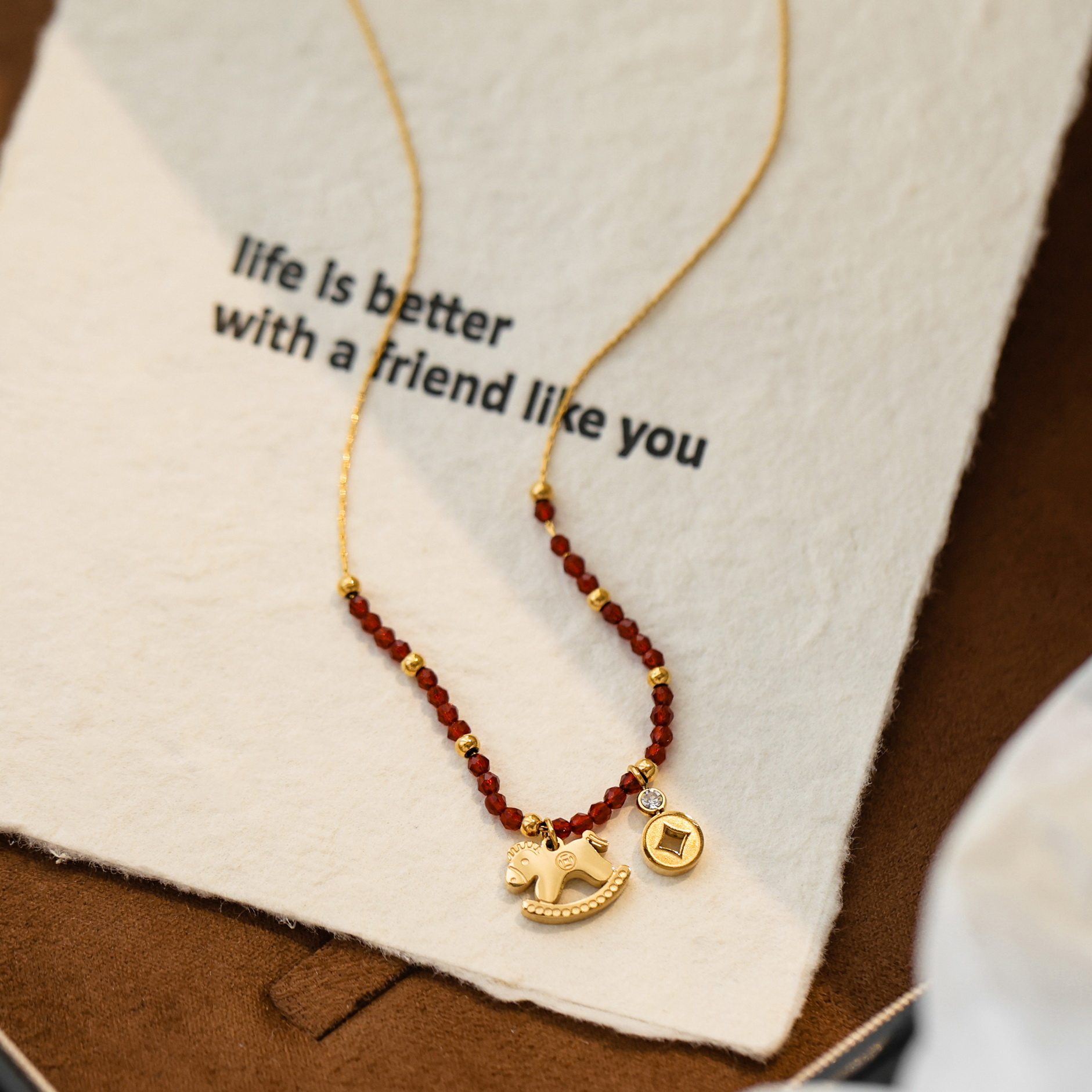 不掉色~高级感轻奢小众马上有钱红尖晶串珠项链女金色吊坠毛衣链