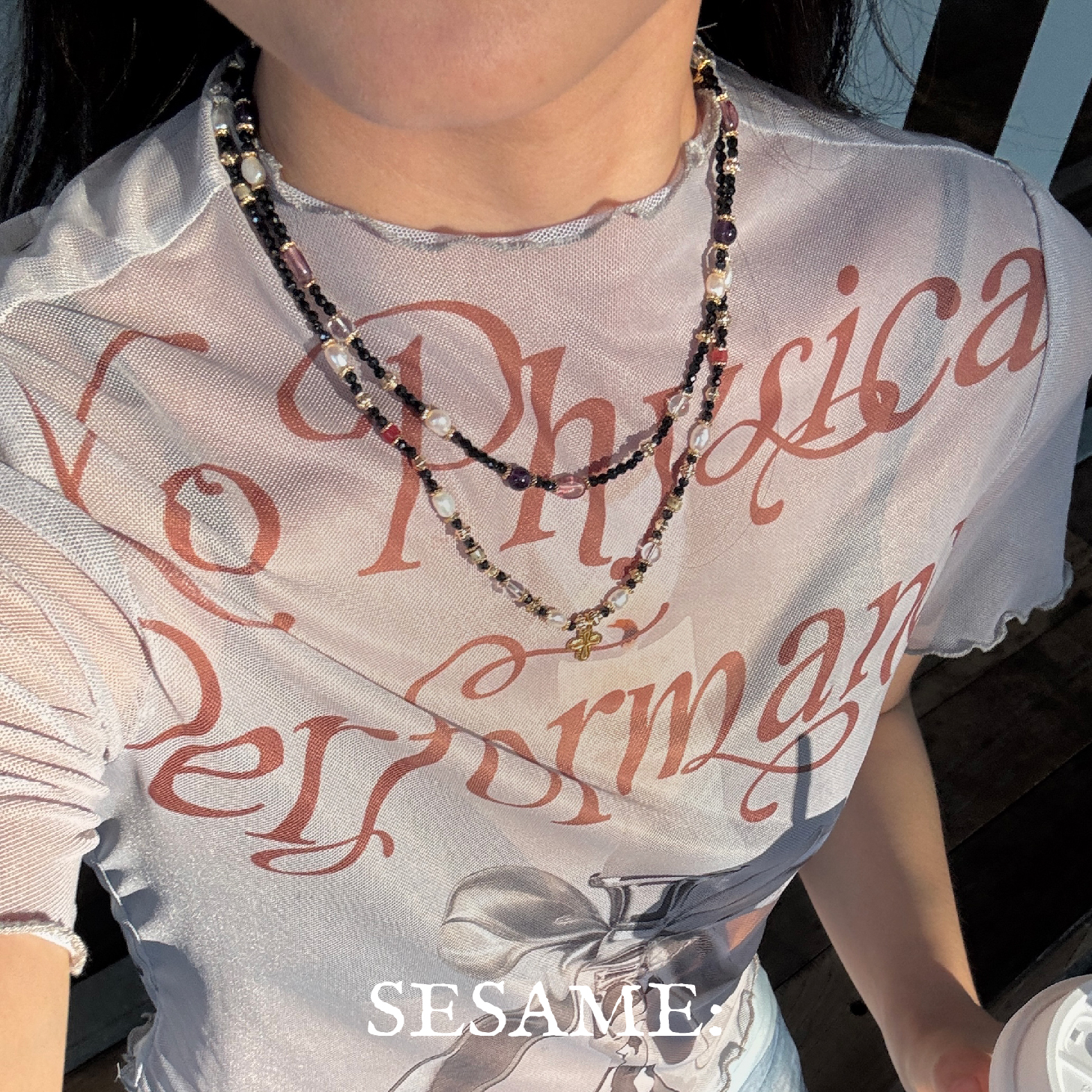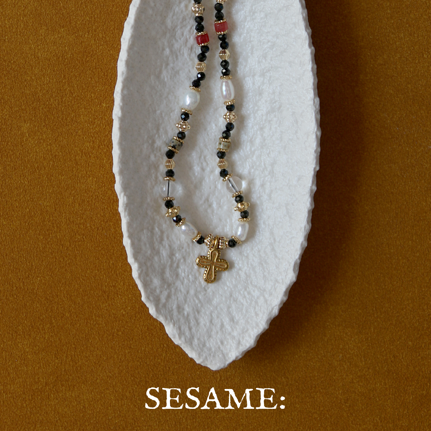 飒米复古中古风天然黑尖晶珍珠十字架镀18k金串珠项链保色毛衣链