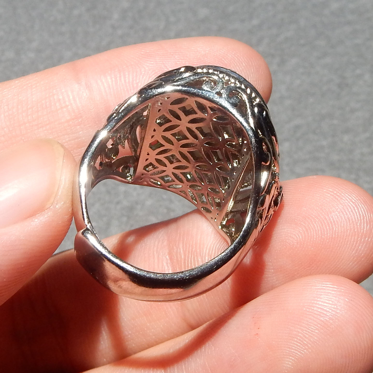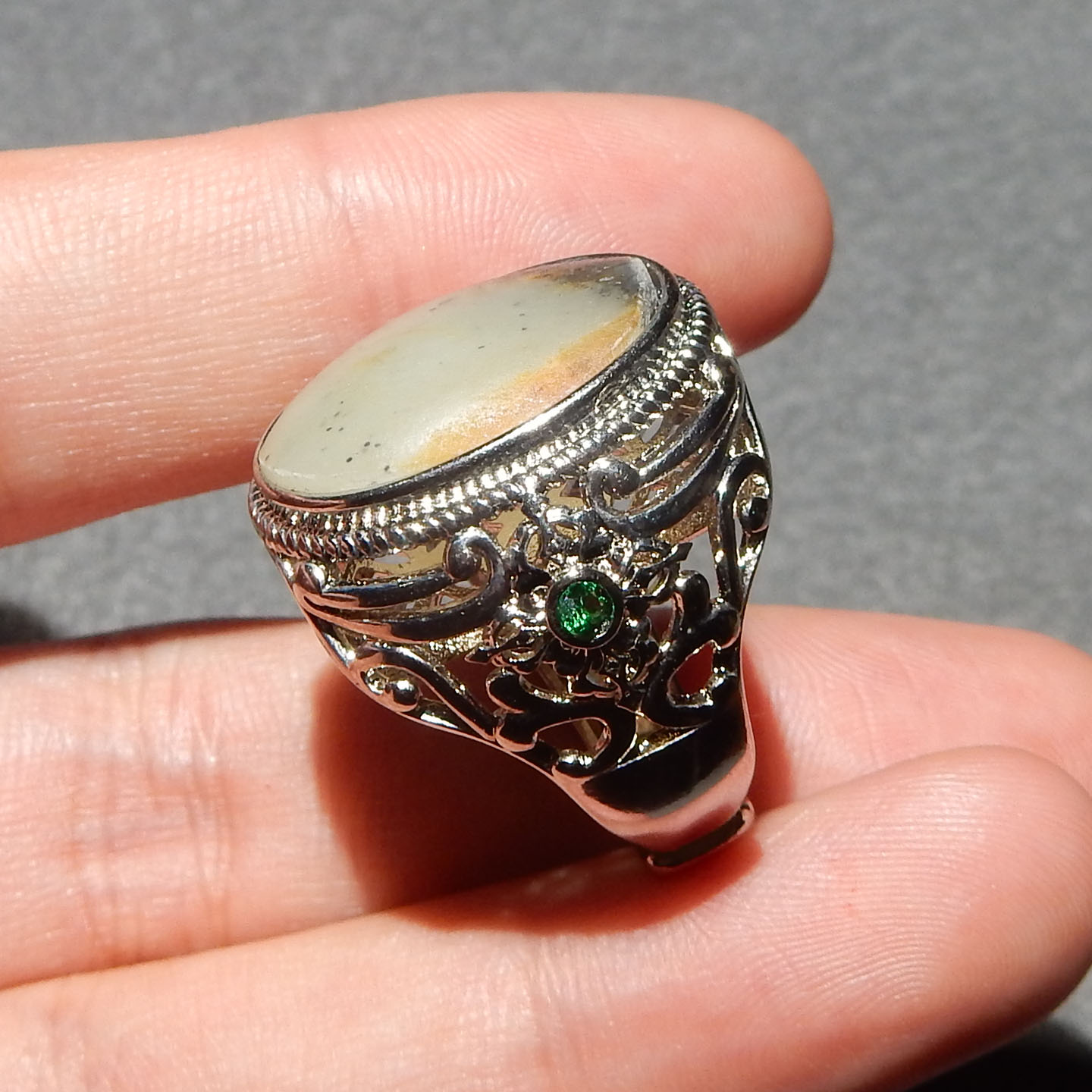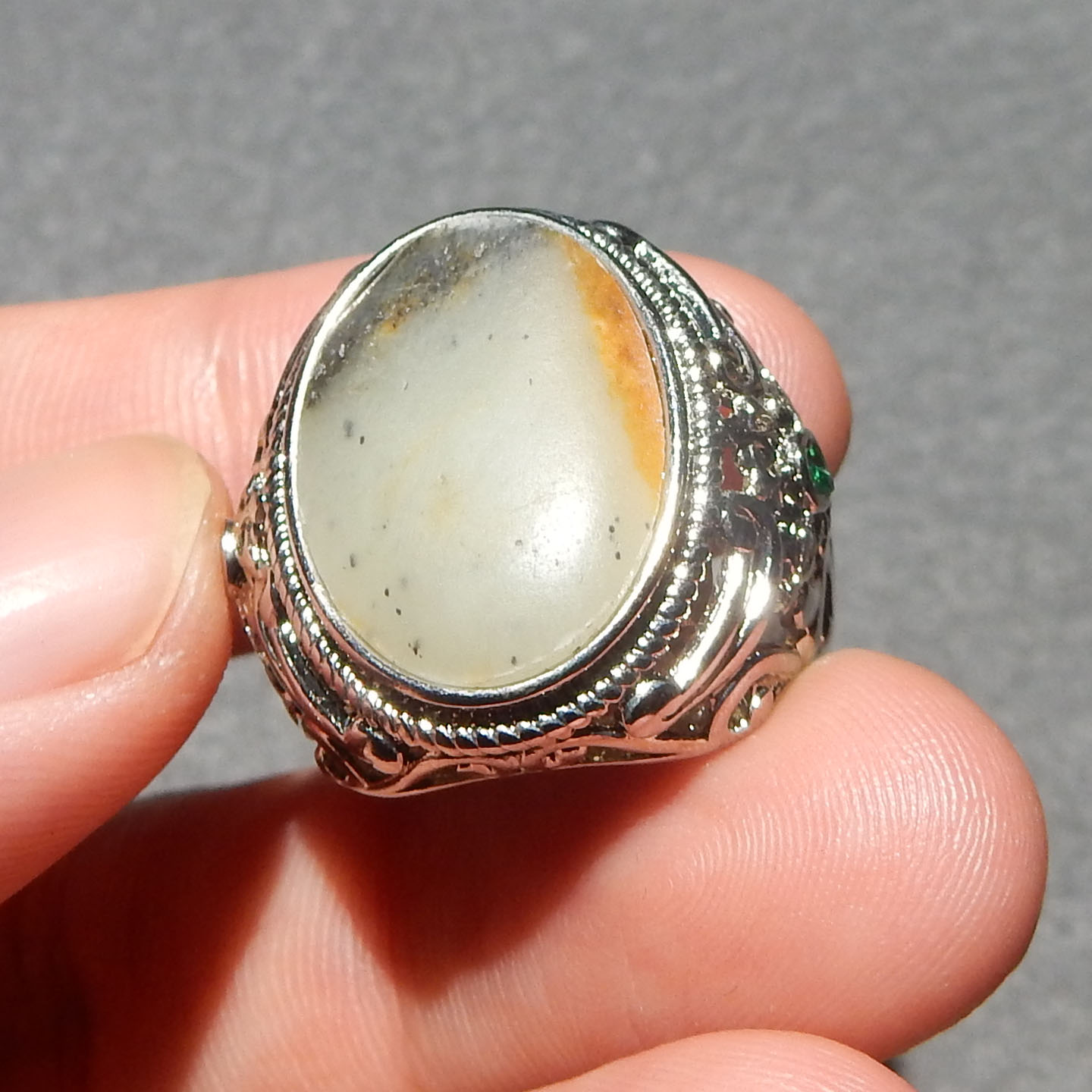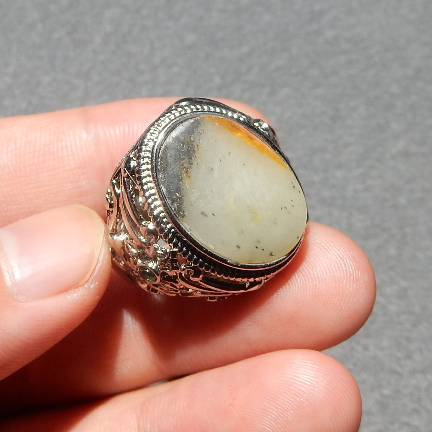 方言企业特色精品白玉籽料黑油皮黄沁皮铜镶嵌三色内径可调戒指w4