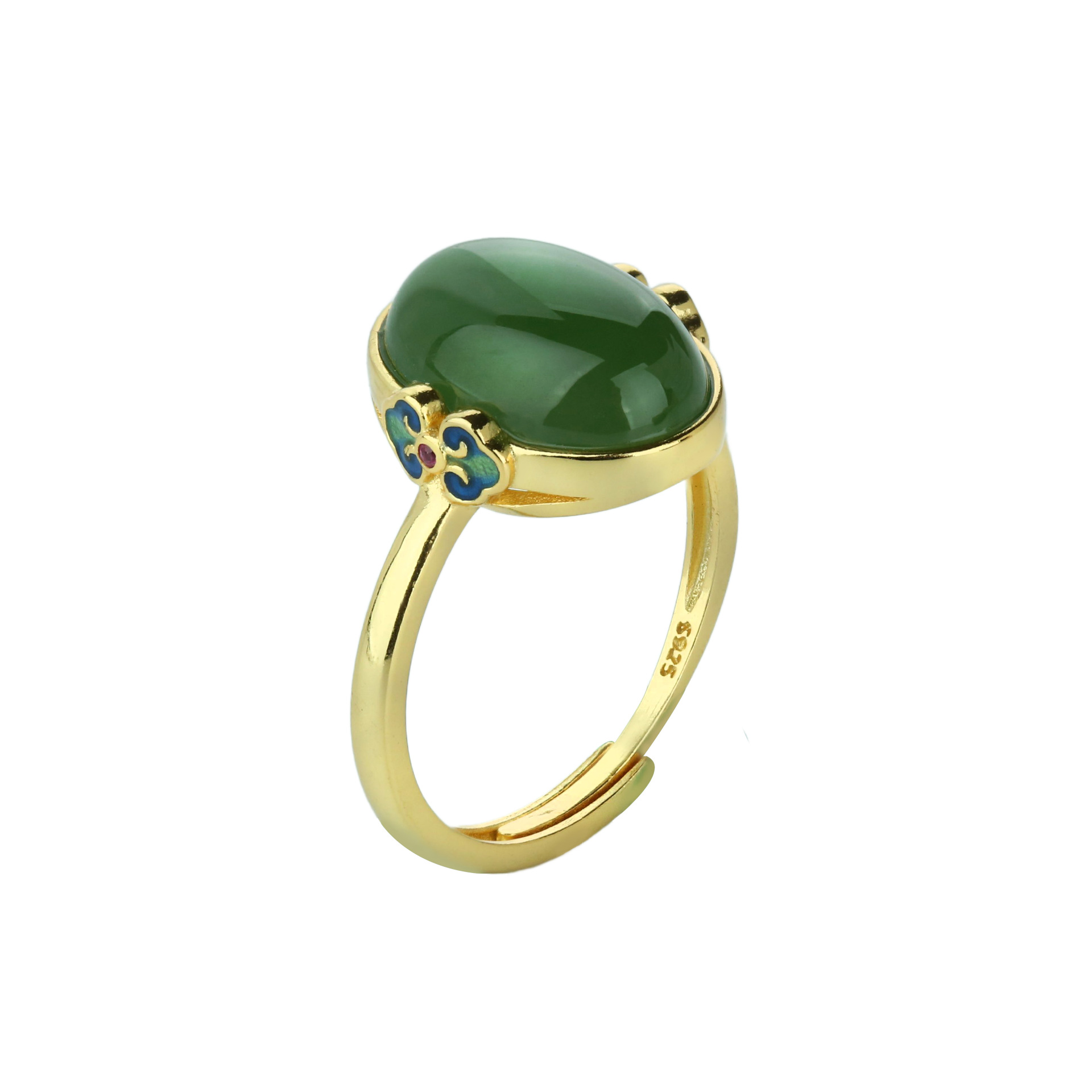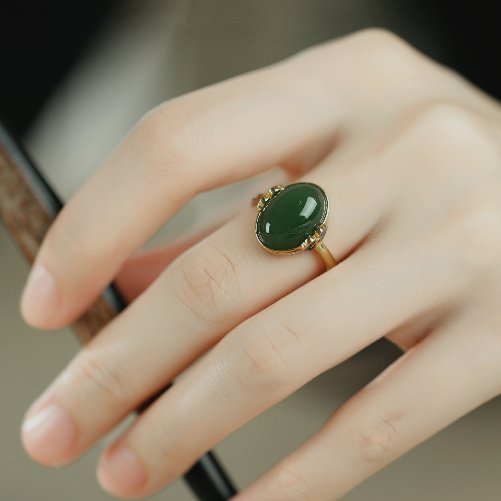 S925纯银镀18k金镶嵌和田碧玉戒指大蛋面简约时尚个性潮流女
