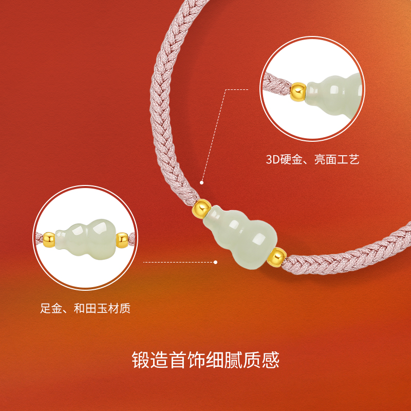 周六福金镶玉3D硬金和田玉双生福禄爱意交织手绳七夕新品节日礼物