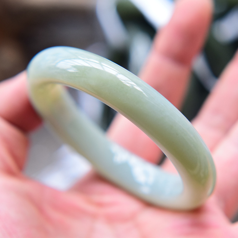 纯天然保真和田玉青白料糖青料美人条圆条淡绿色玉手镯带证书镯子