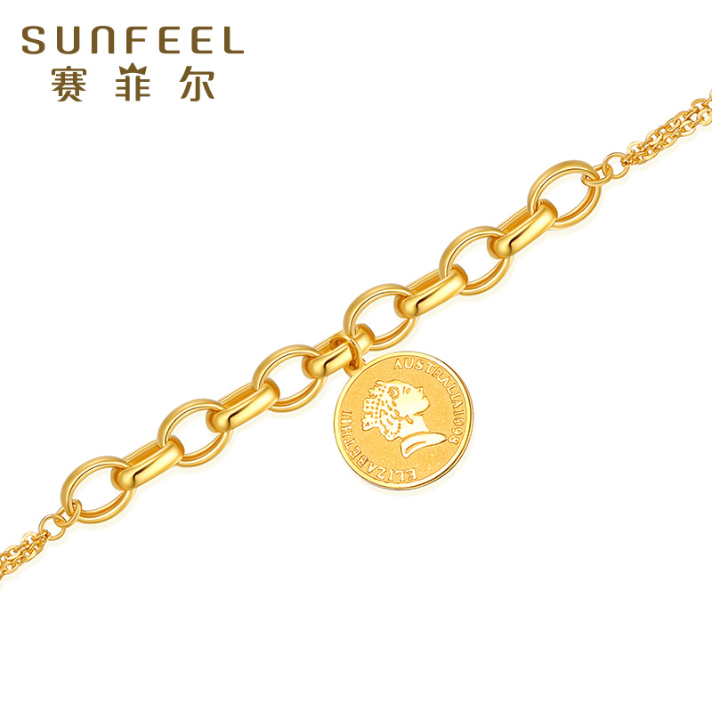 赛菲尔黄金手链足金999.9女王金币手链时尚气质圆牌链条复古女款