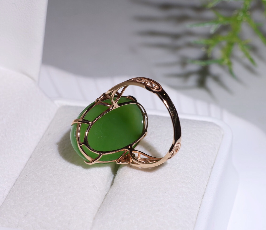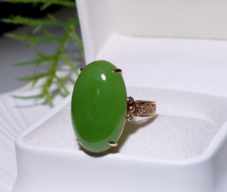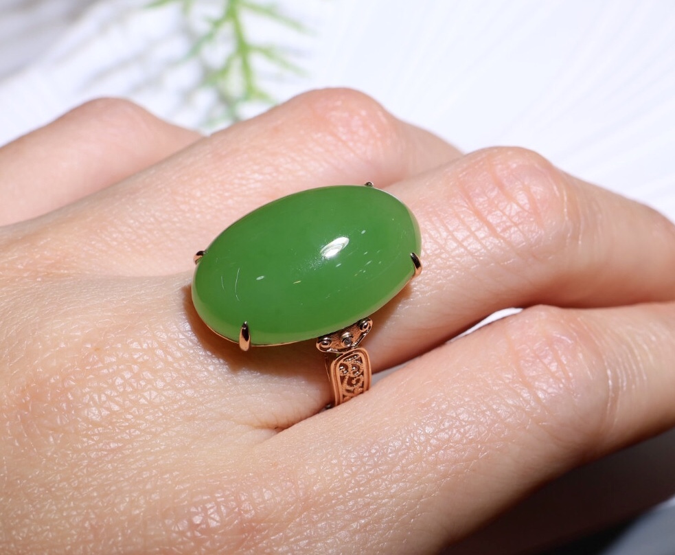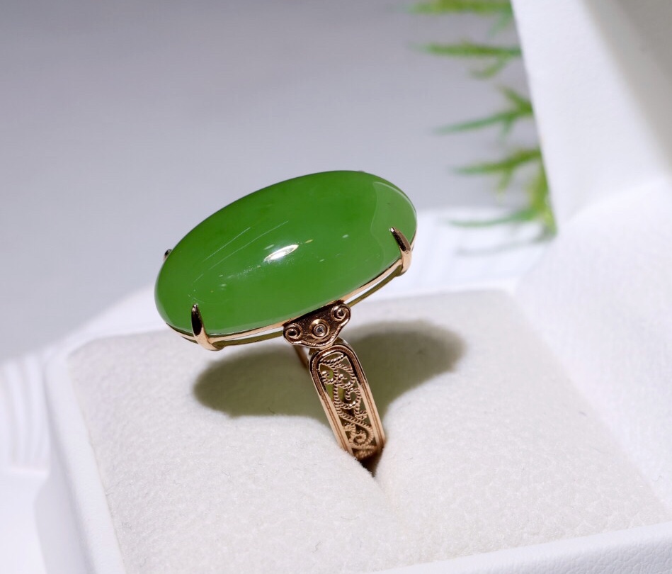年货节天然和田玉戒指女 厚金苹果绿碧玉蛋面镶嵌18k金指环送妈妈
