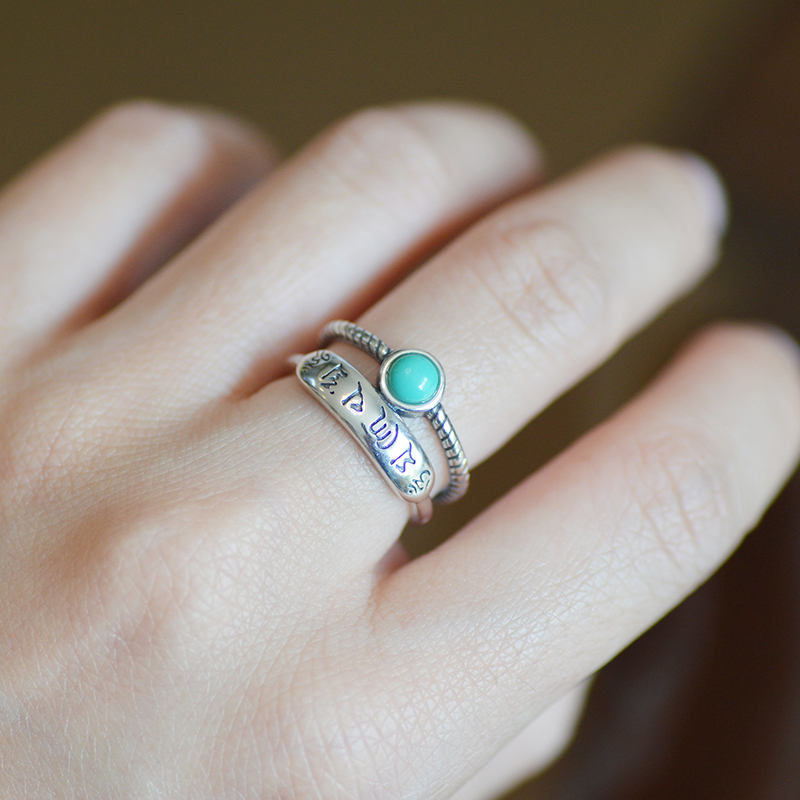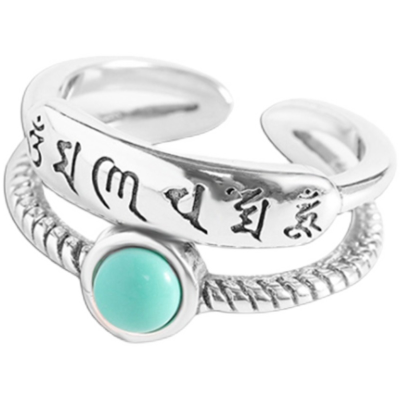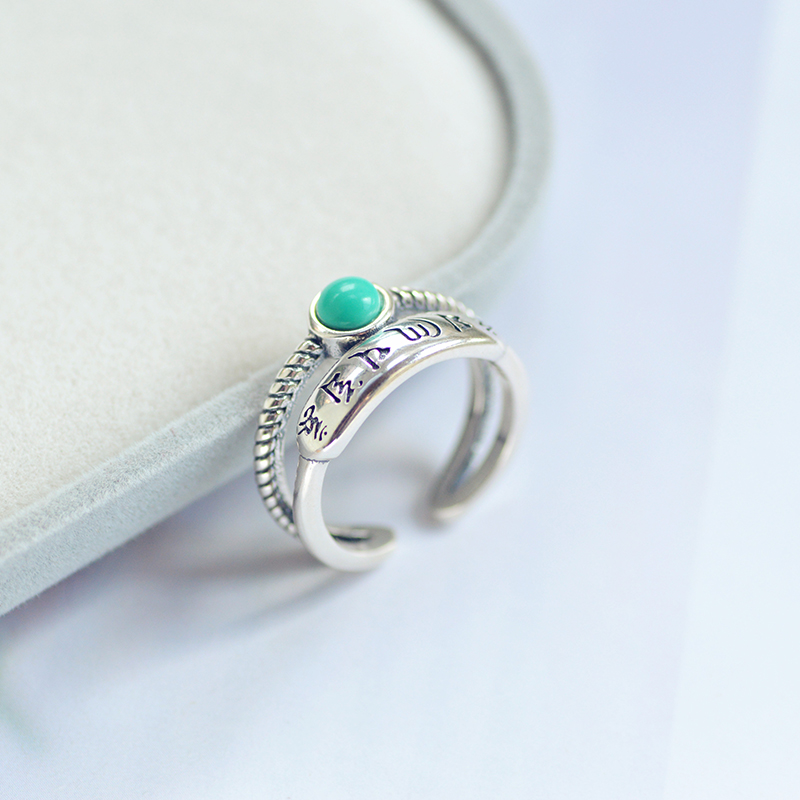 天然原矿绿松石S925银纯银个性复古六字箴言开口多层麻花戒指
