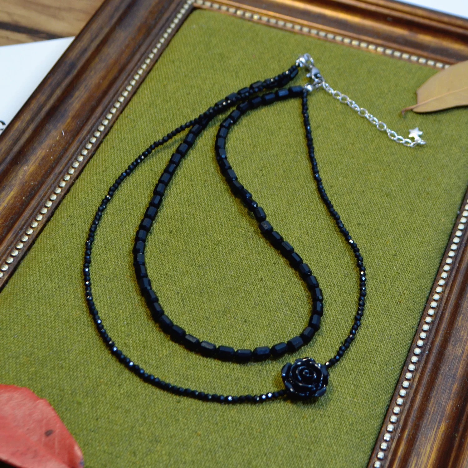 黑色玫瑰花串珠双层项链锁骨链女小众设计时尚复古简约百搭精致