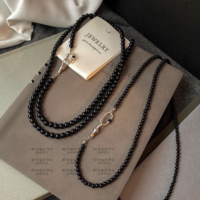 黑色天然石串珠项链2025长款双层叠戴毛衣链小众轻奢高级感颈链女