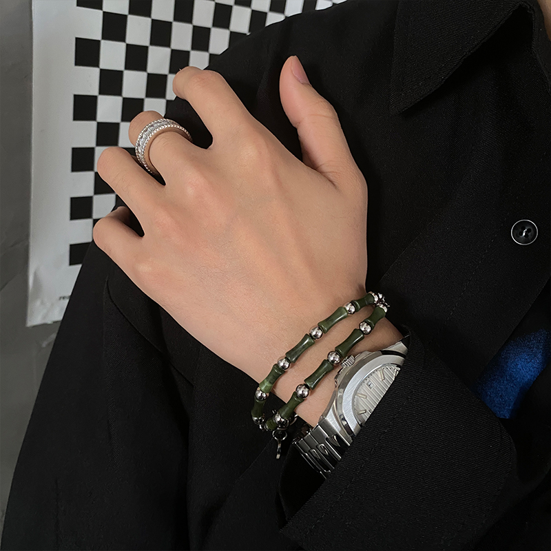 原创国潮ins小众设计橄榄玉竹节拼接钛钢手链男高级感情侣手饰潮