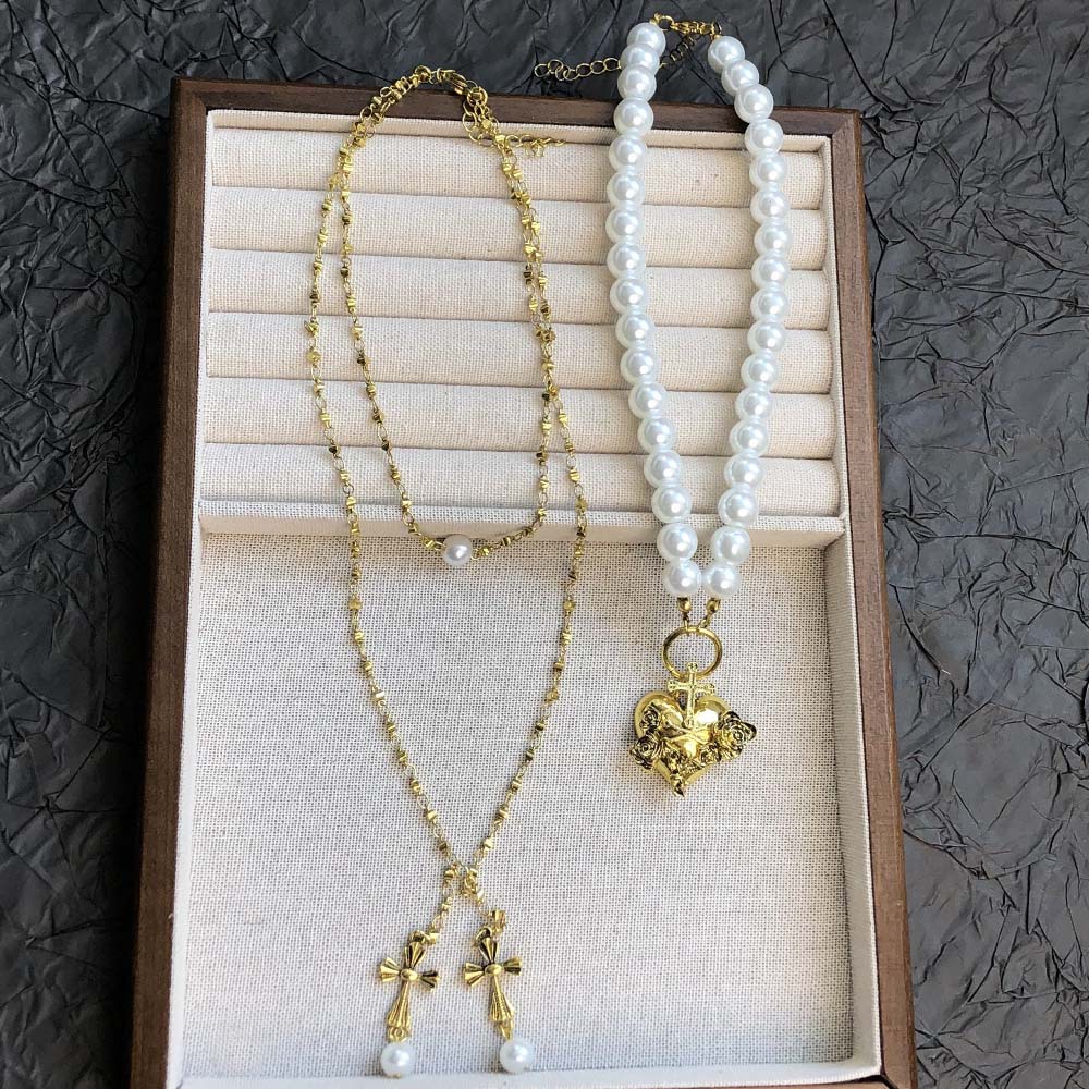 法式长款十字架珍珠爱心项链女串珠链条轻奢毛衣链小众百搭锁骨链