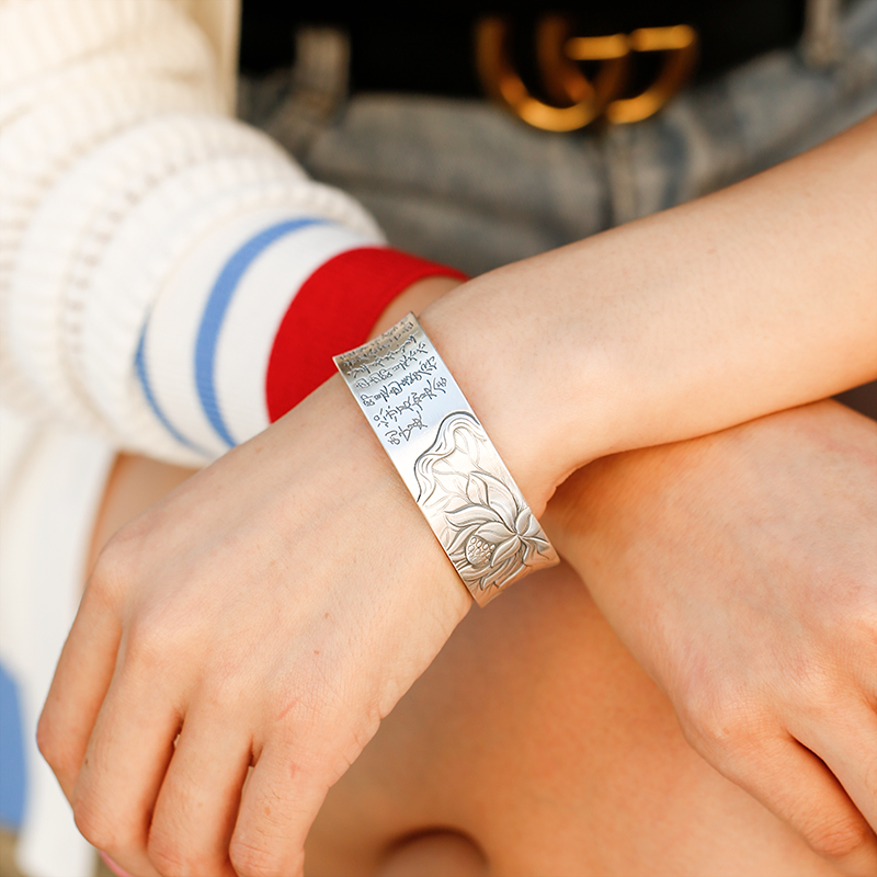 九乐999纯银宽手镯女2024新款心经莲花时尚气质简约民族风定制
