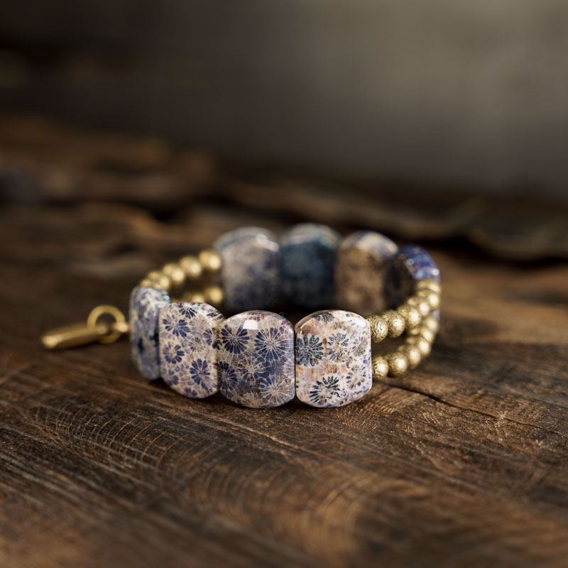 非鱼之家个性设计天然珊瑚石双层手排女 原创复古潮流手链手串男