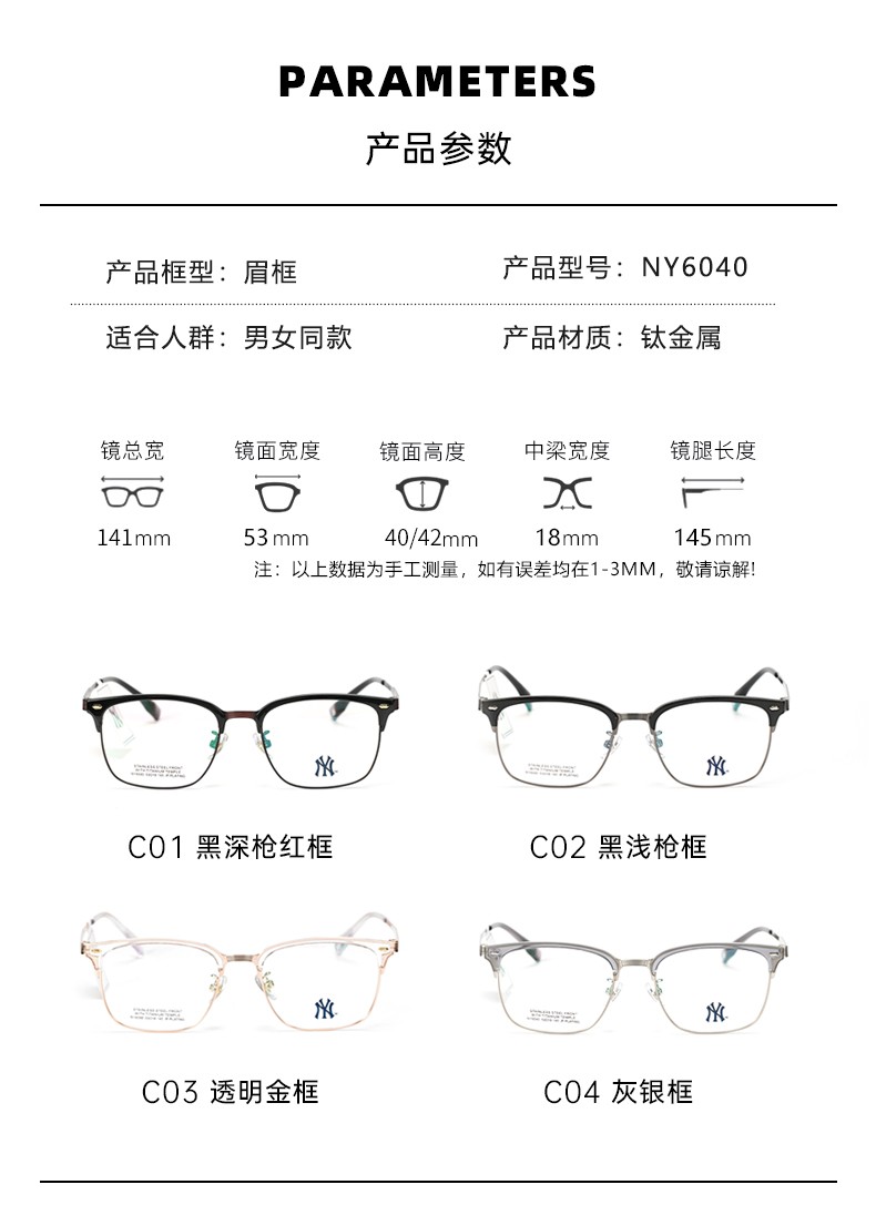 MLB纽约洋基商务半框眼镜男近视大框眼睛可配度数大脸显瘦NY6040
