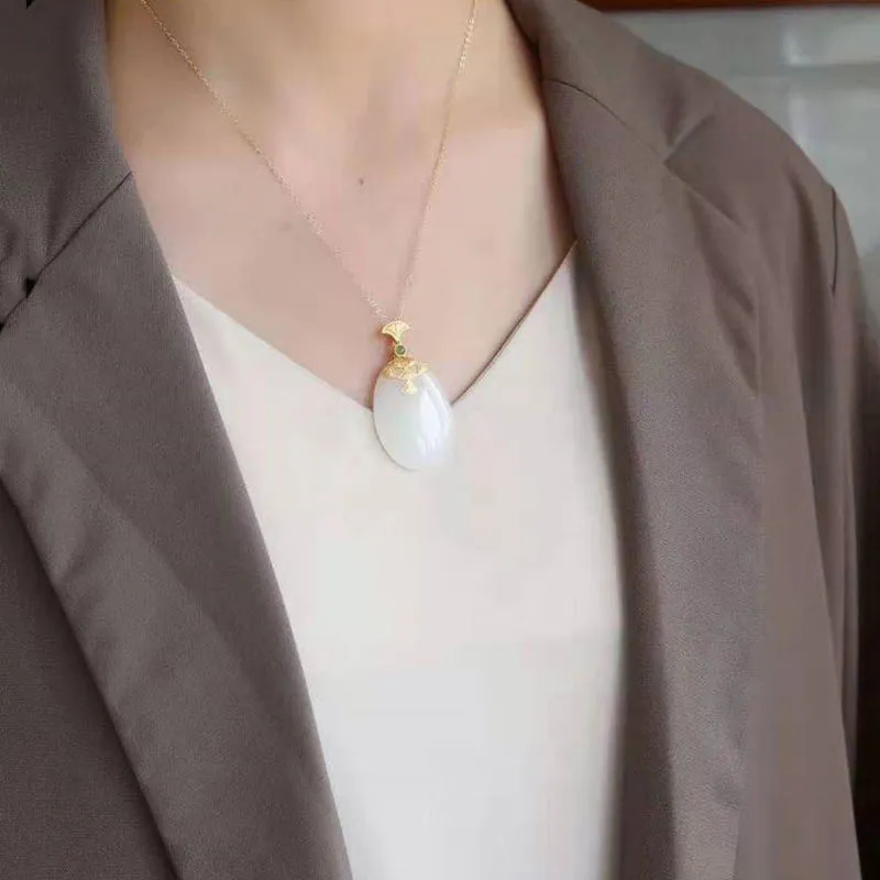 和田玉羊脂玉蛋面吊坠女S925纯银杏叶玉送妈妈生日的礼物项链