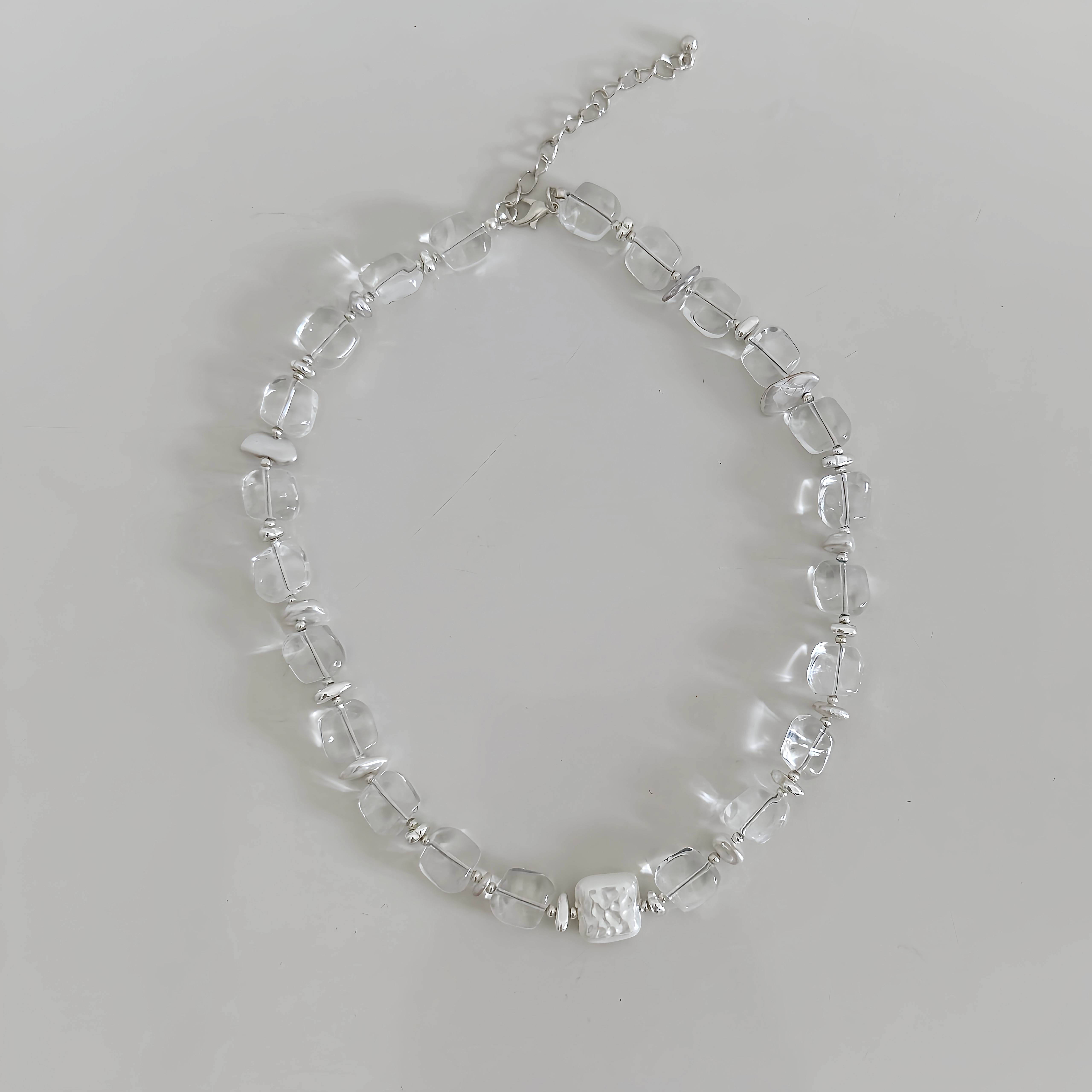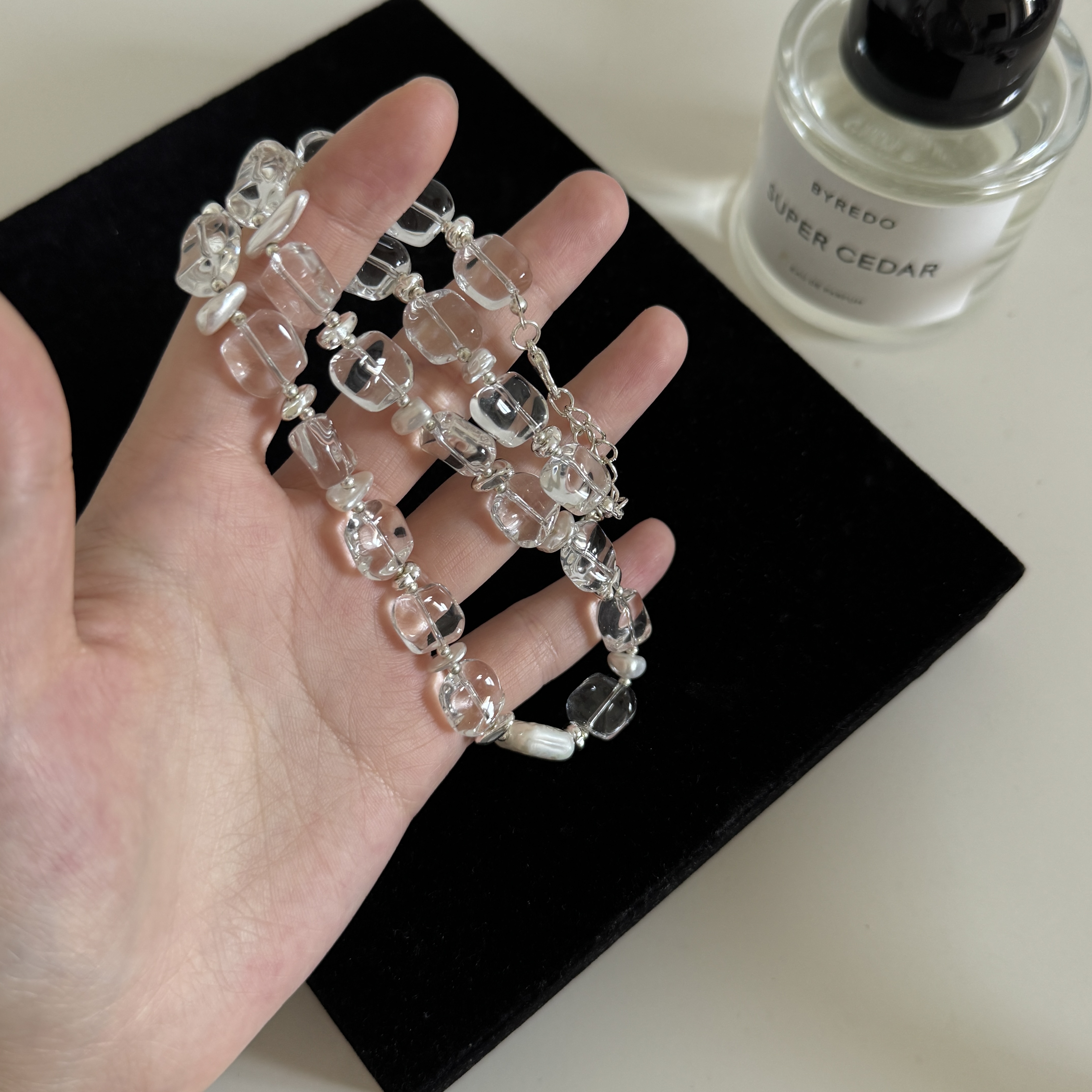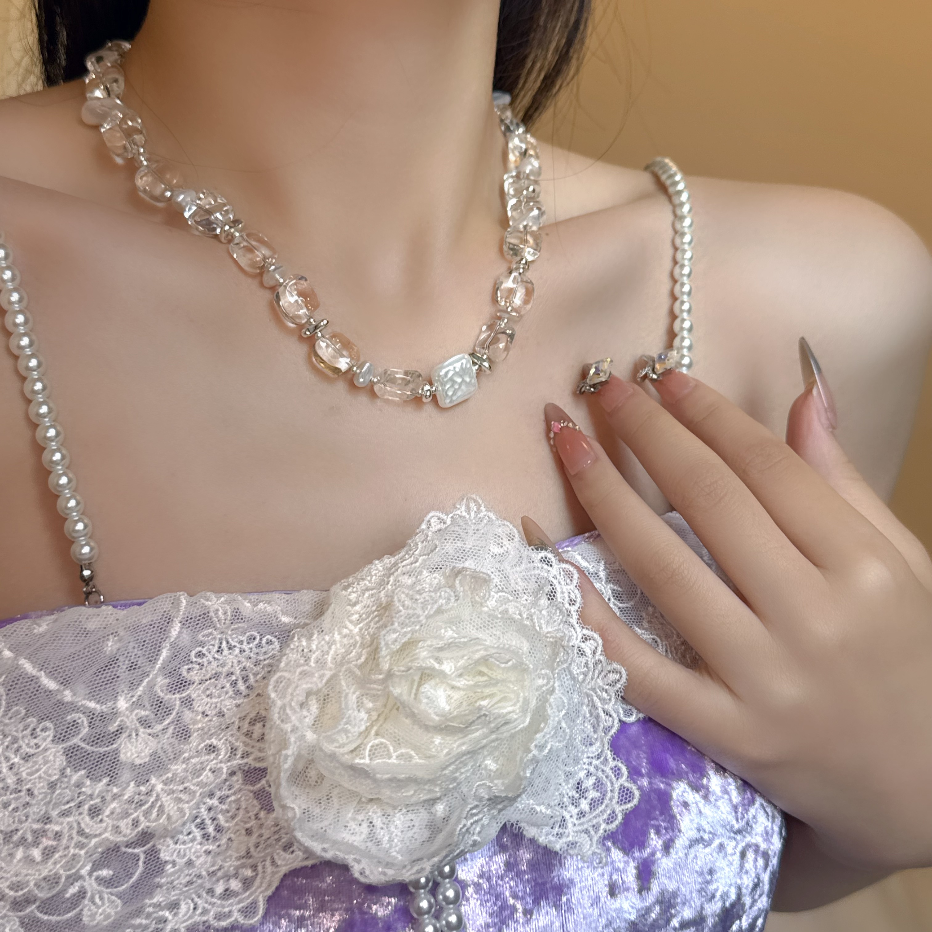 气质轻奢水晶串珠方形珍珠吊坠项链女小众设计感锁骨链时尚颈链女