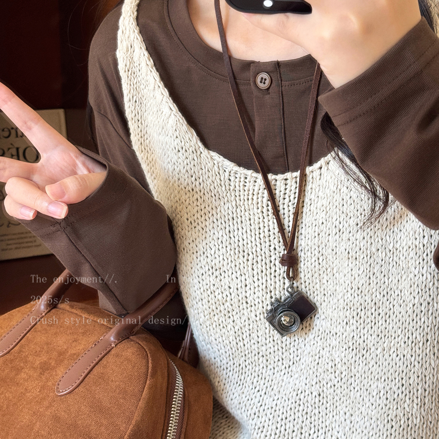 美式复古~美拉德咖色皮质小包吊坠项链女小众设计挂脖毛衣链配饰