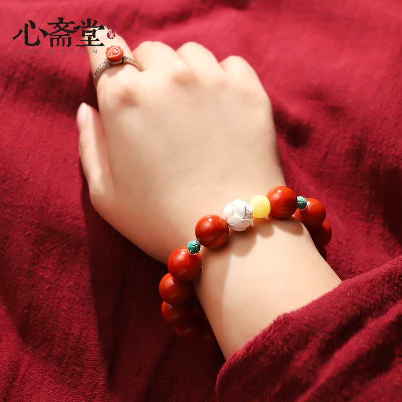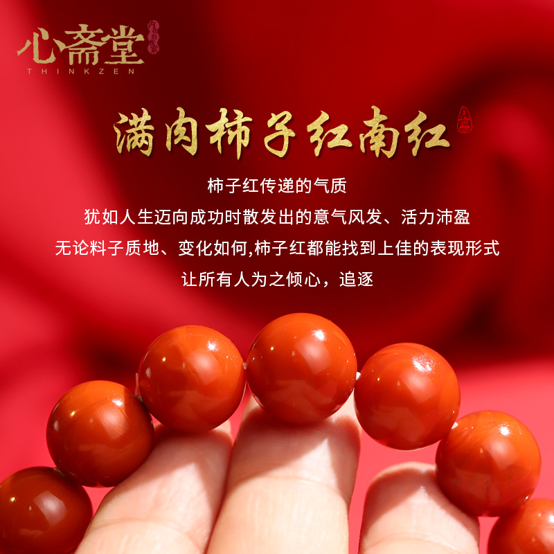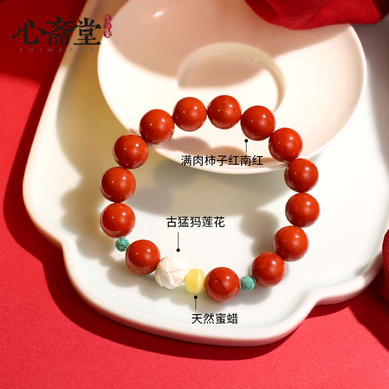 心斋堂【赤莲观心】保真原矿天然南红玛瑙手串女款满肉柿子红手链