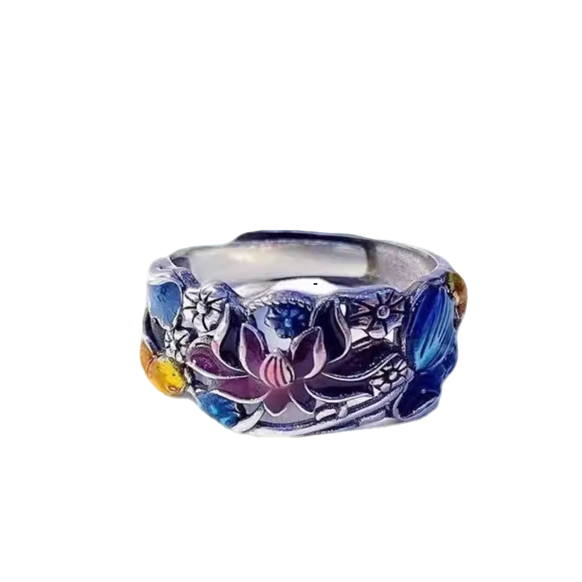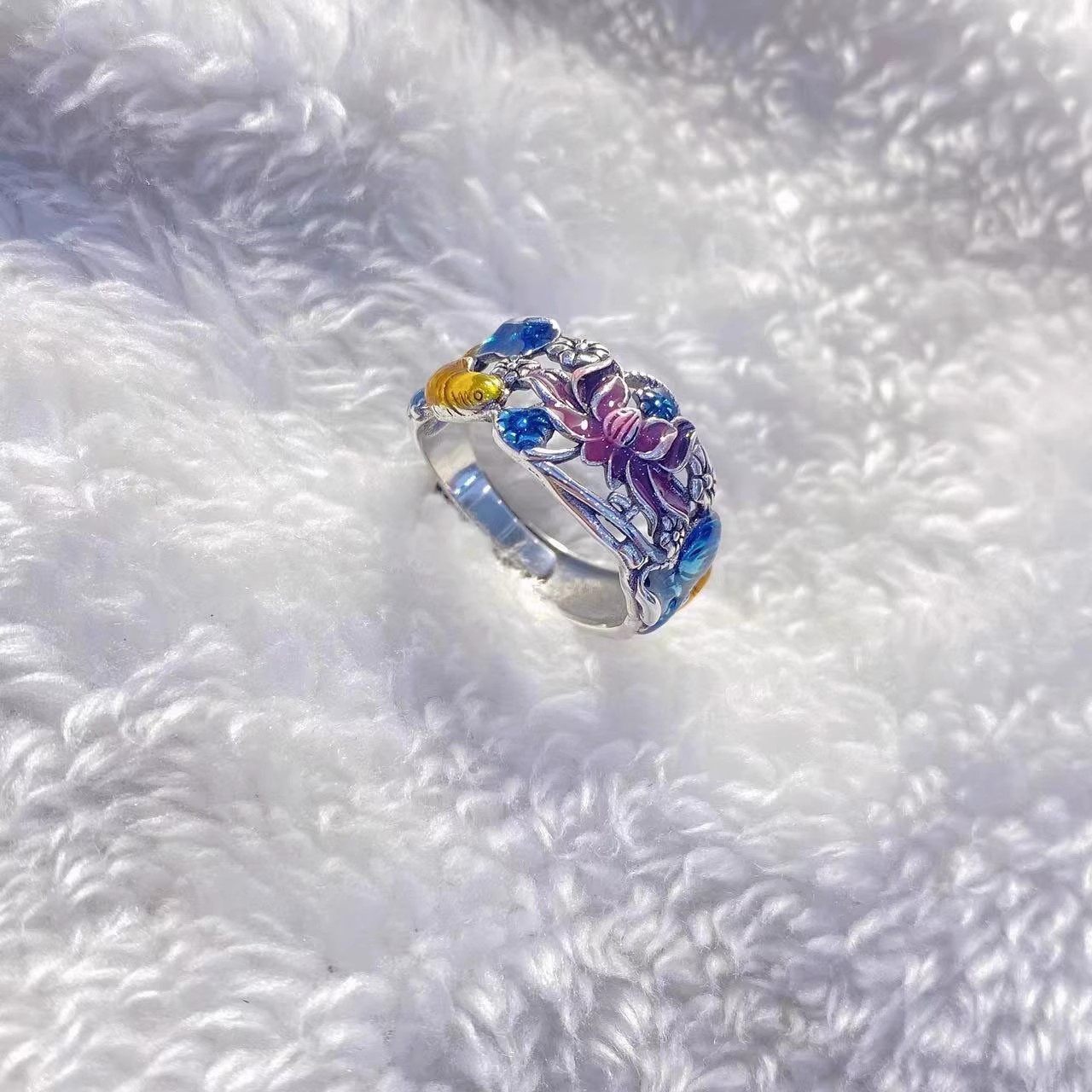 古法锦鲤荷花复古戒指女百搭彩油工艺显白气质荷花古典文艺食指环