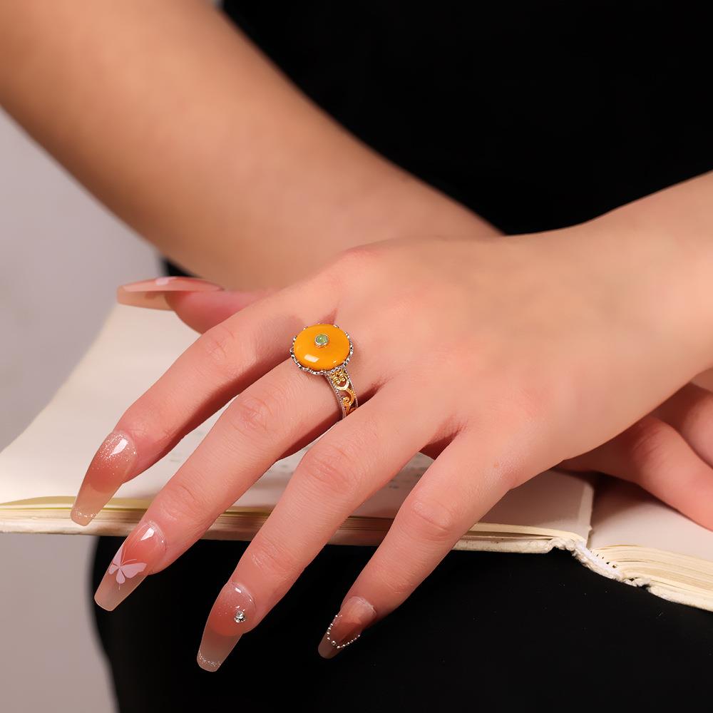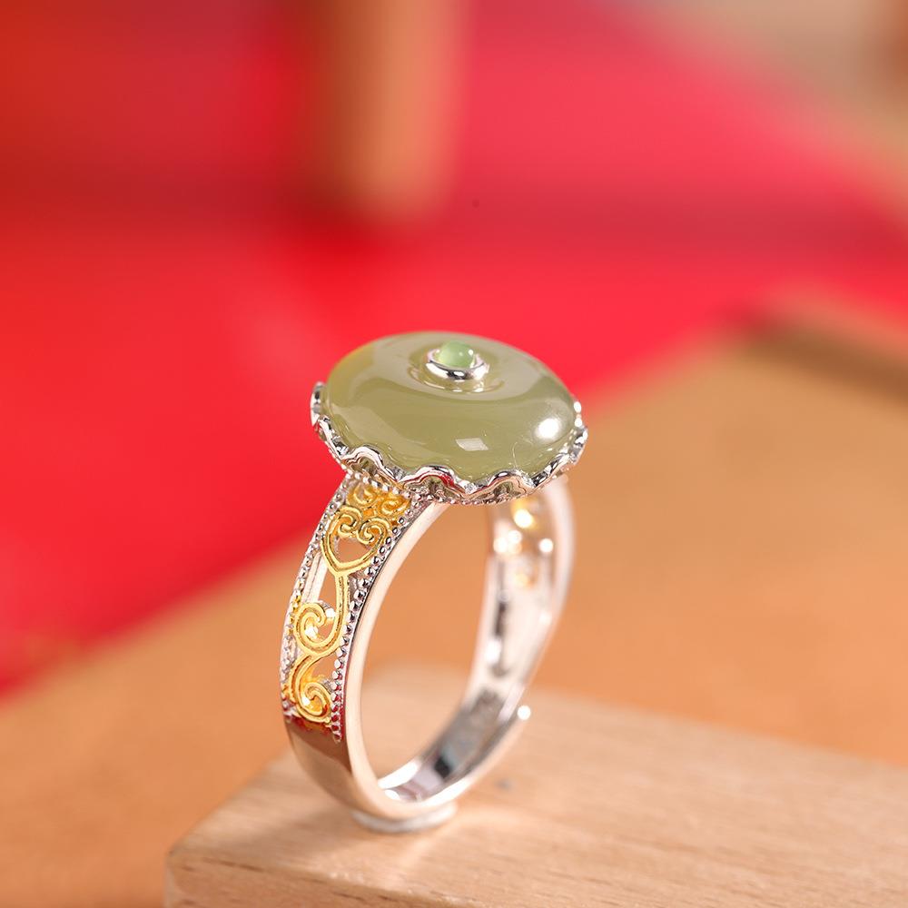 本命年925纯银和田玉碧玉蜜蜡国潮复古戒指如意镂空银指环礼物