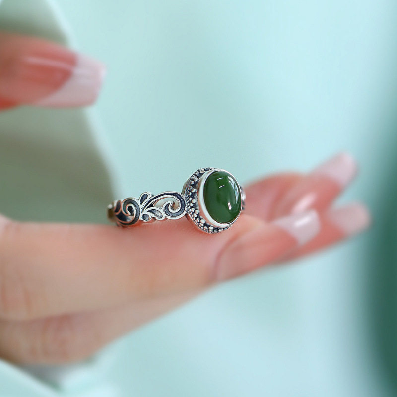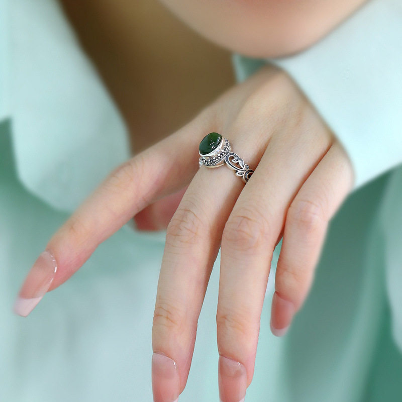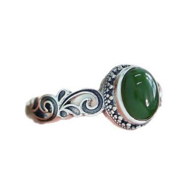 925银复古新中式卷草纹和田碧玉蛋面戒指环开口调节做旧民族风女