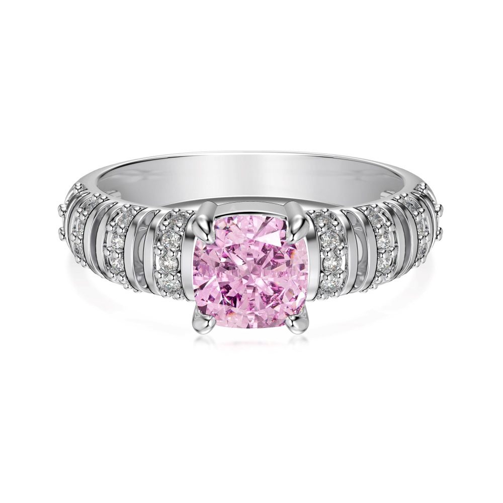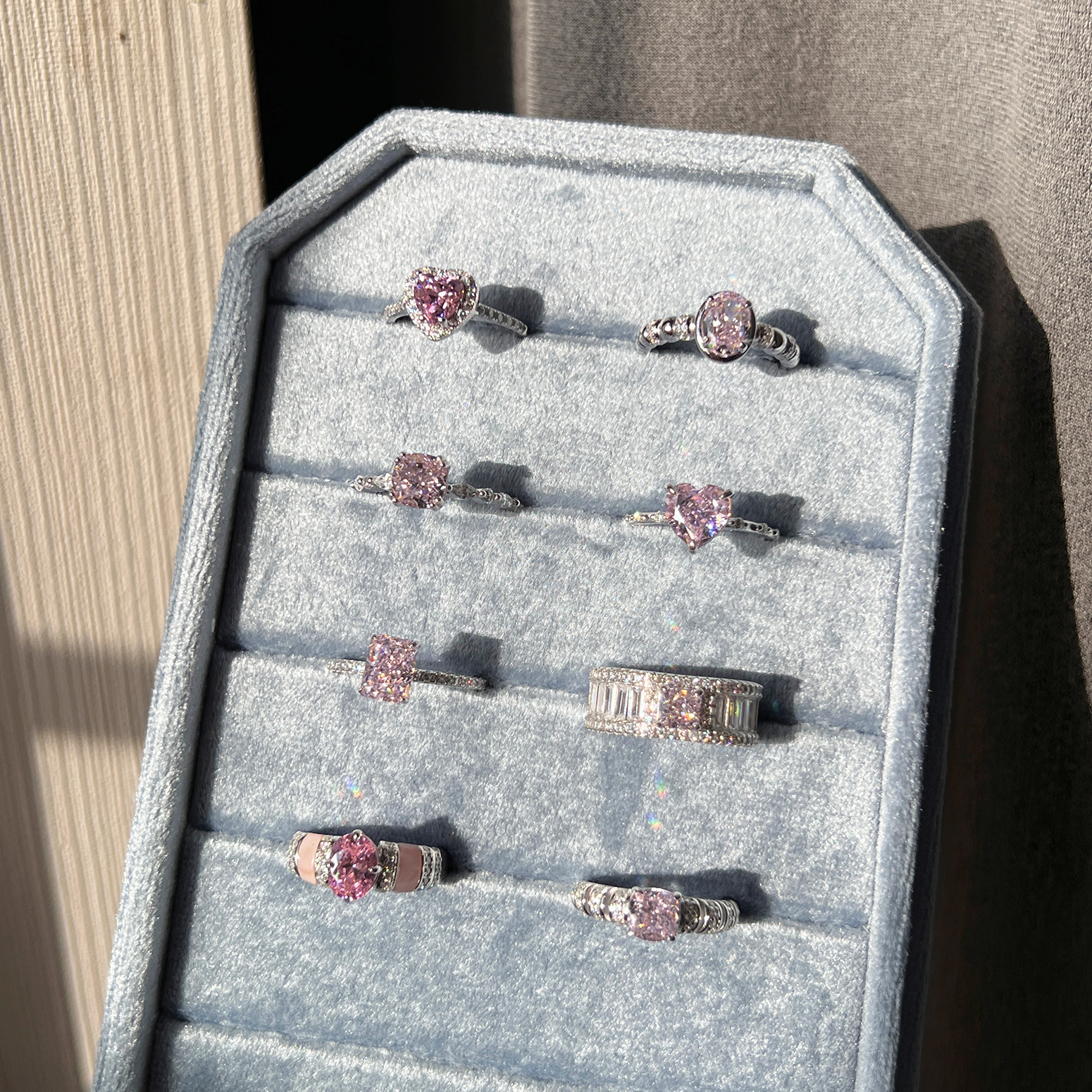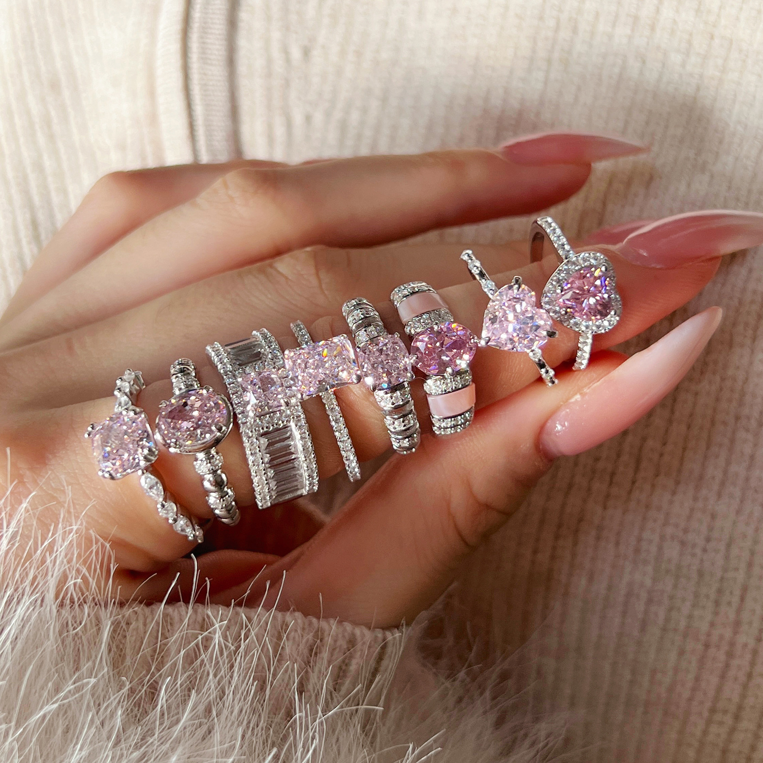 欧美爆款S925纯银戒指女粉色冰花切锆石镶嵌精致爱心方糖女士