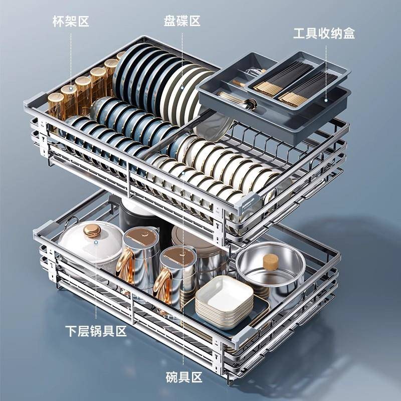 轻奢拉篮厨房橱柜304不锈钢双层抽屉式内置碗柜碗碟收纳碟架碗篮
