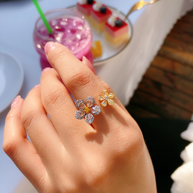 高级设计师款玫瑰切工中彩黄玫瑰双花开口彩色黄钻锆石戒指女
