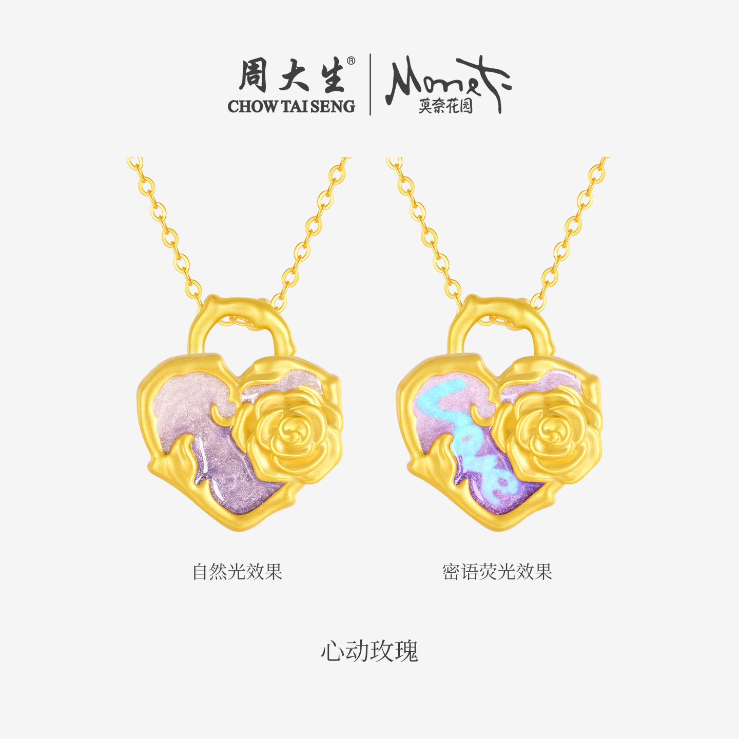 周大生黄金莫奈吊坠月下玫瑰足金硬金荧光珐琅项链圣诞礼物送女友