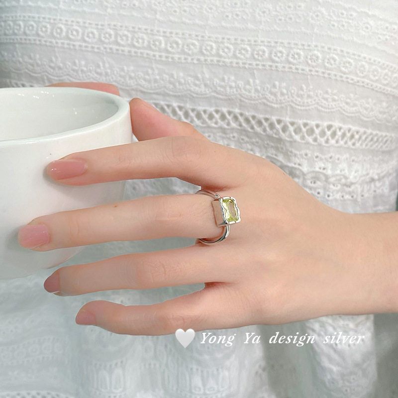 S925纯银夏季新款绿葡萄方钻戒指几何简约ins高级气质戒指可调节