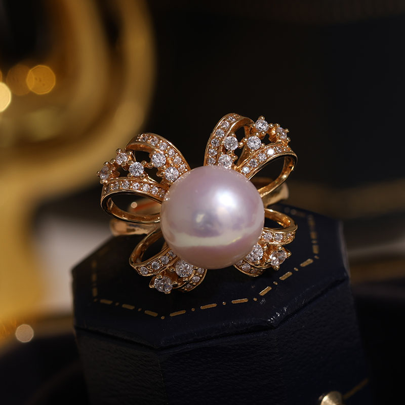 DIY珍珠配件S925纯银精工时尚蝴蝶结戒指托指环戒托空托配9-11mm