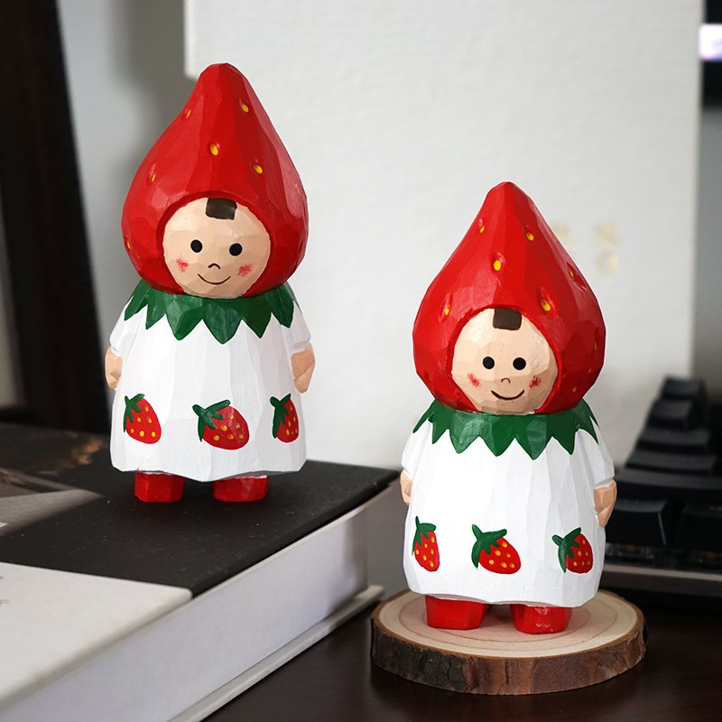 草莓娃娃手工木雕小摆件公仔可爱木质雕刻治愈系卡通书桌装饰品