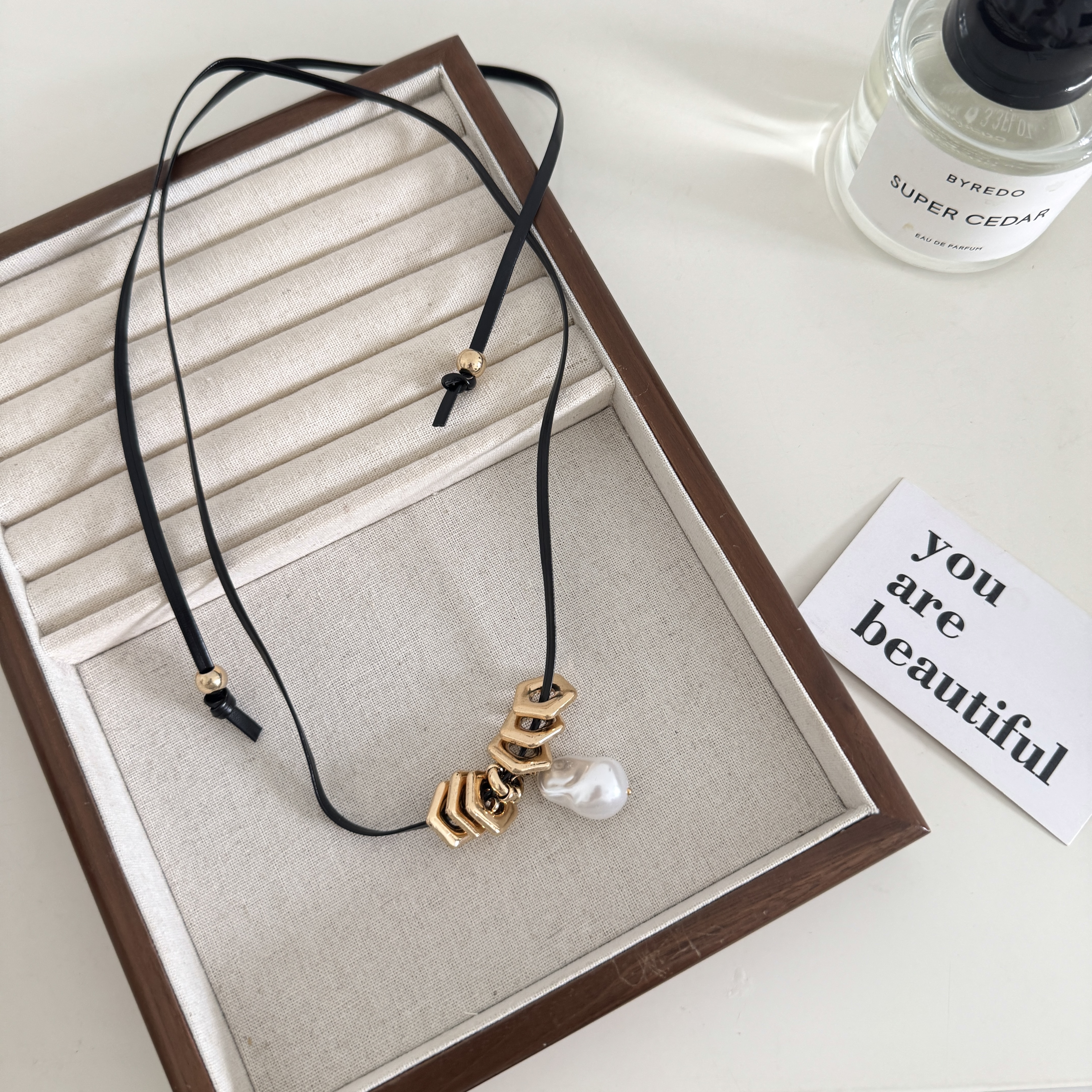 巴洛克珍珠异形坠项链女黑色皮绳抽拉设计几何金属块高级感毛衣链