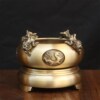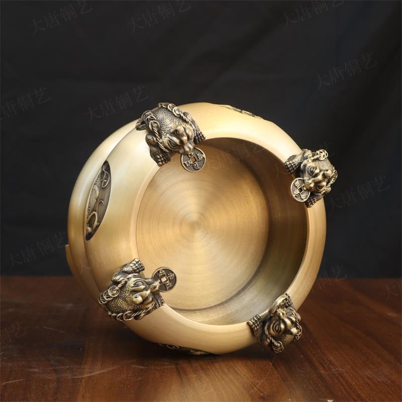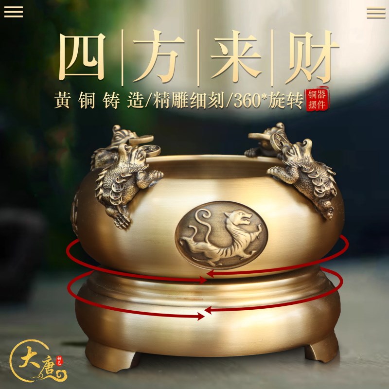 纯黄铜四方来财聚宝盆摆件居家时来运转室内桌面铜四象金蟾聚宝盆