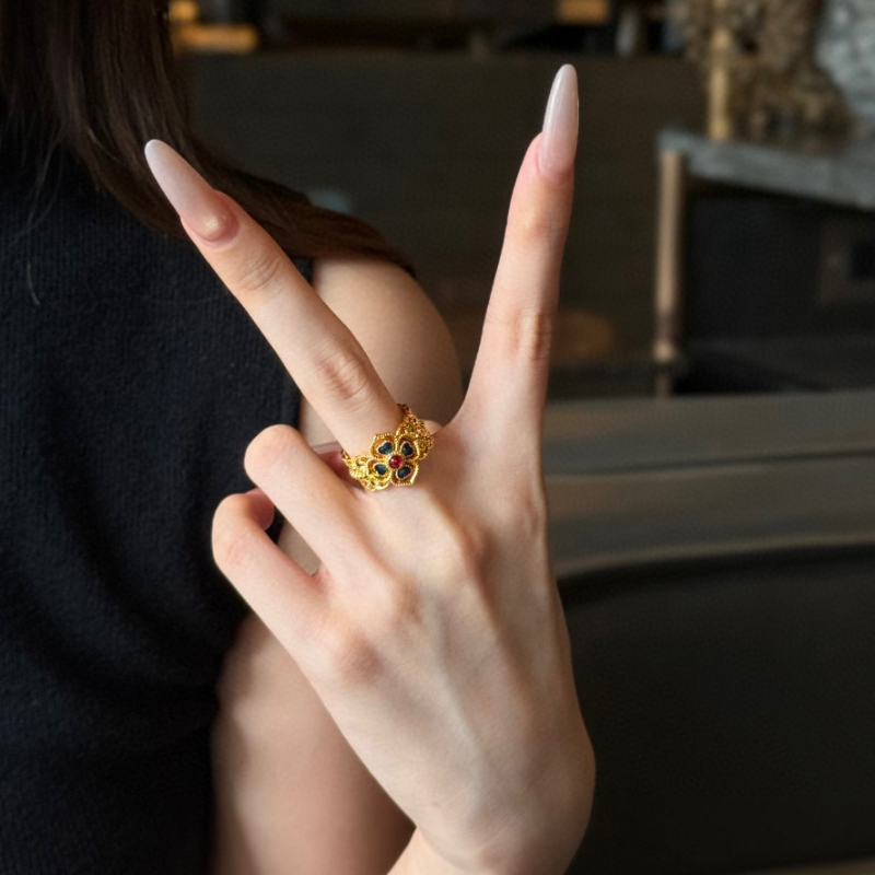 5D硬金黄金花窗戒指女999足金宫廷风点钻镶嵌指环纯金正品食指戒