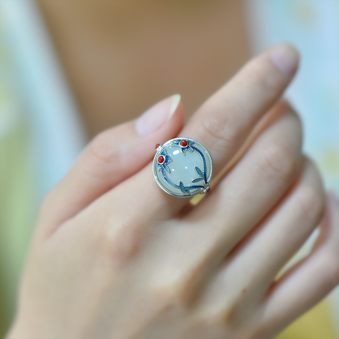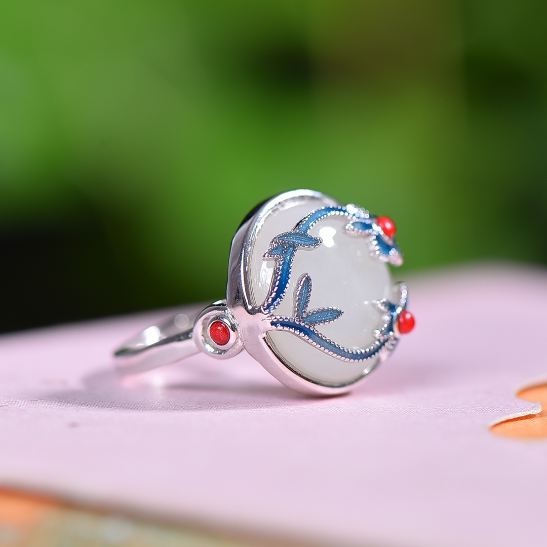 S925银镀18K金镶和田玉白玉蛋面女宫廷复古戒指戒圈汉服配饰指环