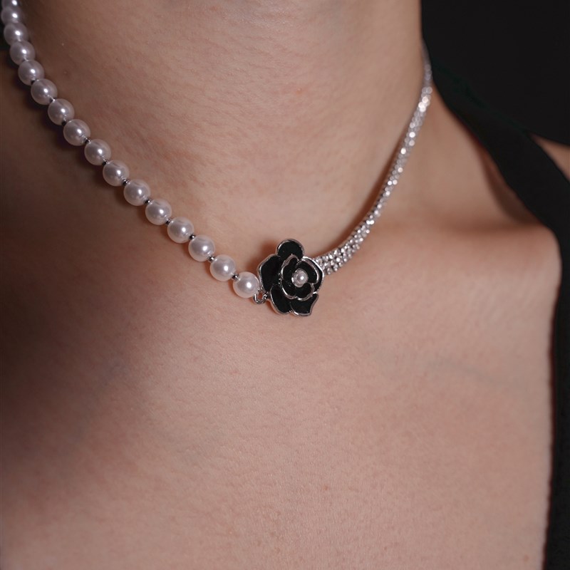 「曼哈顿晚宴」复古n赫本风高级感法式小众黑色山茶珍珠项链锁骨