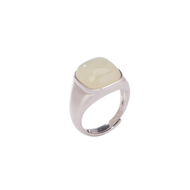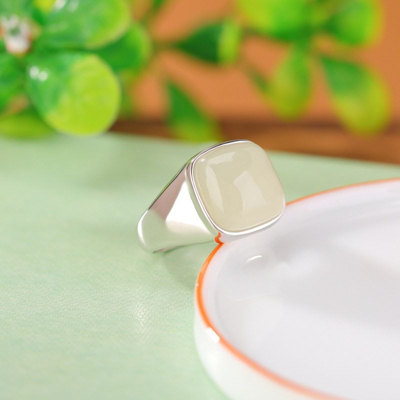 925纯银天然和田玉复古气质简约方形戒指几何开口可调节指环新款