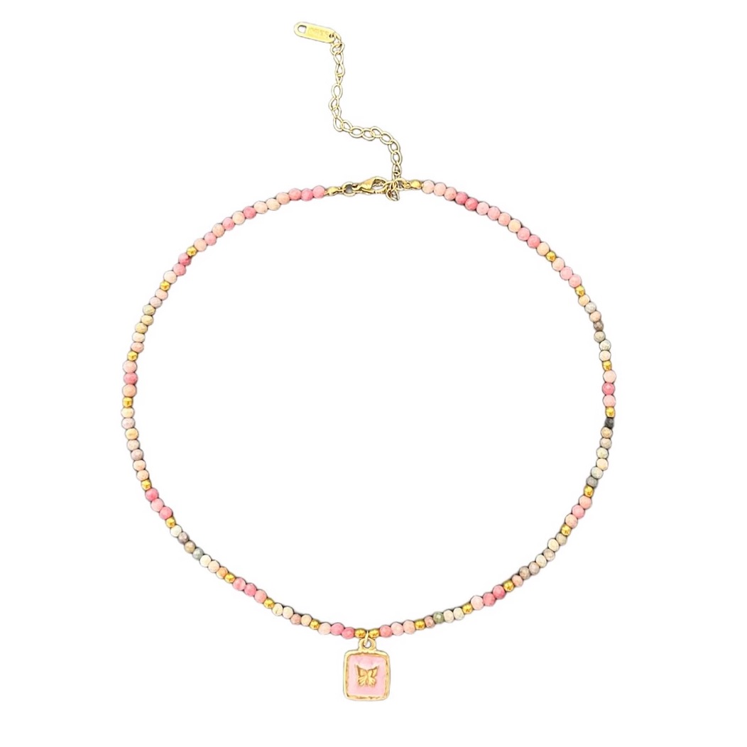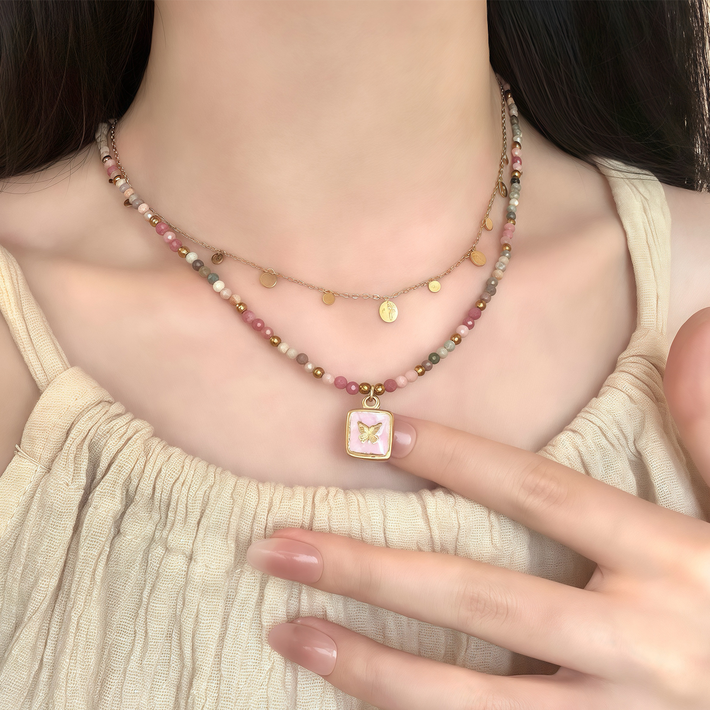 粉色天然石串珠蝴蝶吊坠项链女2025新款复古轻奢小众高级感锁骨链