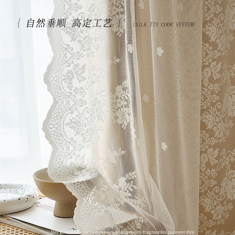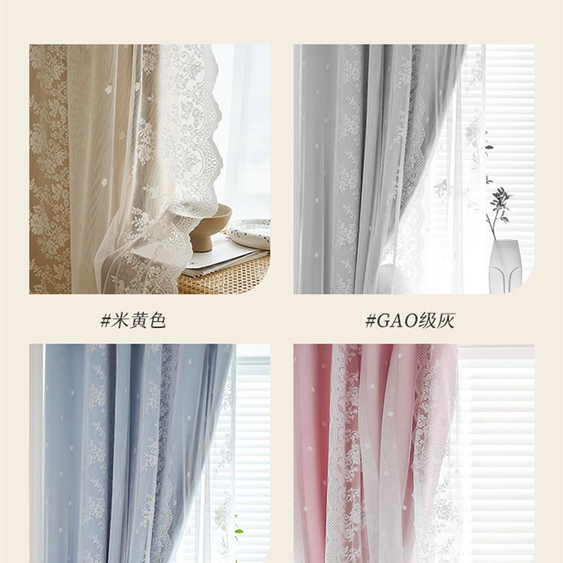 速发法式双层遮光窗帘卧室一飘纱布窗体奶茶色蕾丝纱帘挂钩式