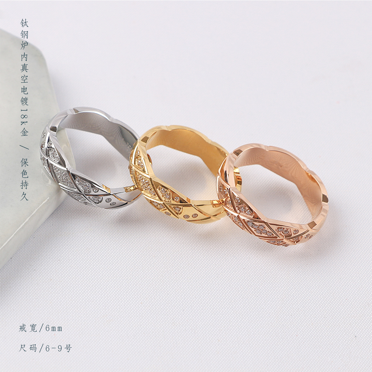 经典小香风菱形格纹戒指女高级感轻奢镀18K金钛钢食指戒指不掉色